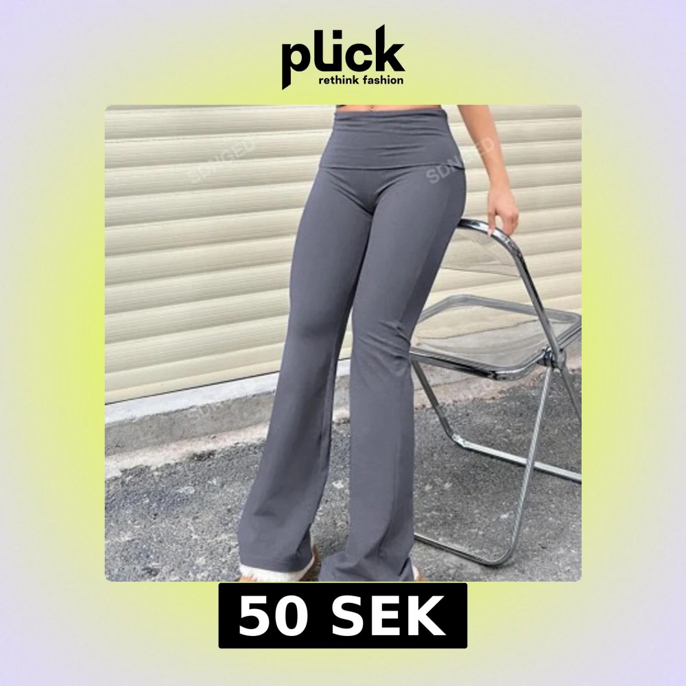 Snygga grå bootcut byxor med hög midja. Perfekta för en stilren look, dessa byxor har en tight passform upptill och vida ben. Tillverkade i ett mjukt och stretchigt material för extra komfort.
