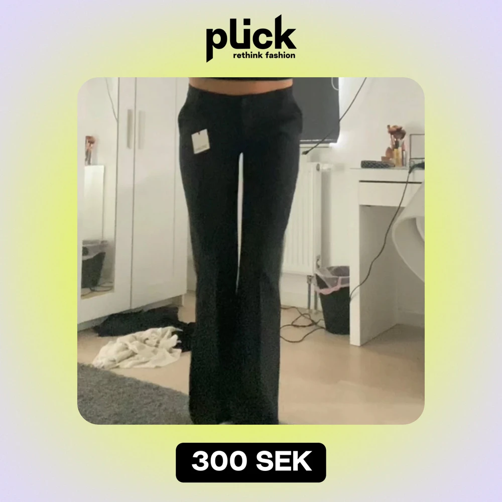 Säljer ett par snygga svarta byxor i bootcut-stil. De är lågmidjade och har en tight passform upptill som övergår i en utsvängd nederdel. Perfekta för både vardag och fest! 🖤