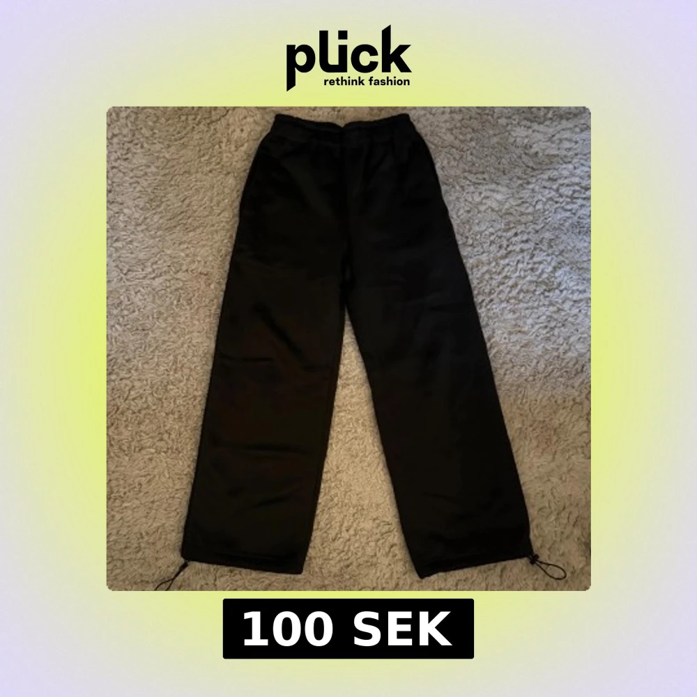 Svarta mjukisbyxor med bred passform och dragsko längst ner vid bensluten. Byxorna har elastisk midja och är tillverkade i ett mjukt material som känns skönt mot huden. Perfekta för en avslappnad och trendig look.