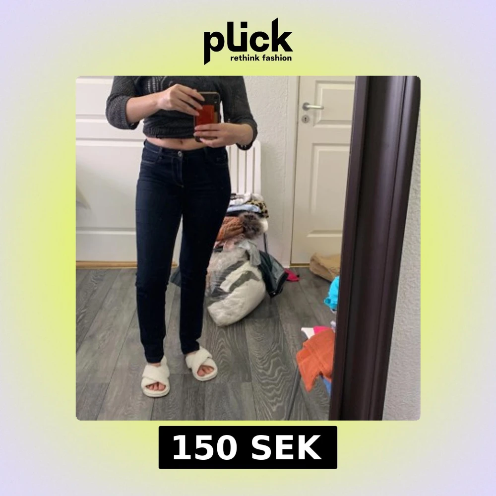 Säljer ett par mörkblå jeansbyxor från b.young med klassisk femficksdesign och smal passform. Byxorna har normalhög midja och är perfekta för dig som gillar en enkel och stilren look. Snygga att matcha med både crop top och stickad tröja.