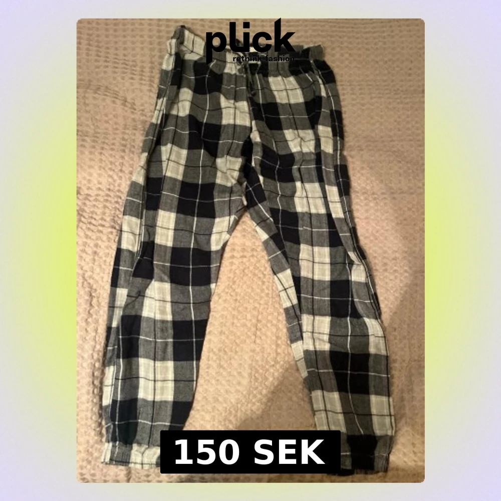 Rutiga mjukisbyxor i svart, grått och vitt från Cubus, storlek M. Byxorna har elastisk midja med snörning och muddar vid bensluten. Perfekta för chill dagar och har en loose passform. Materialet känns mjukt och bekvämt mot huden.