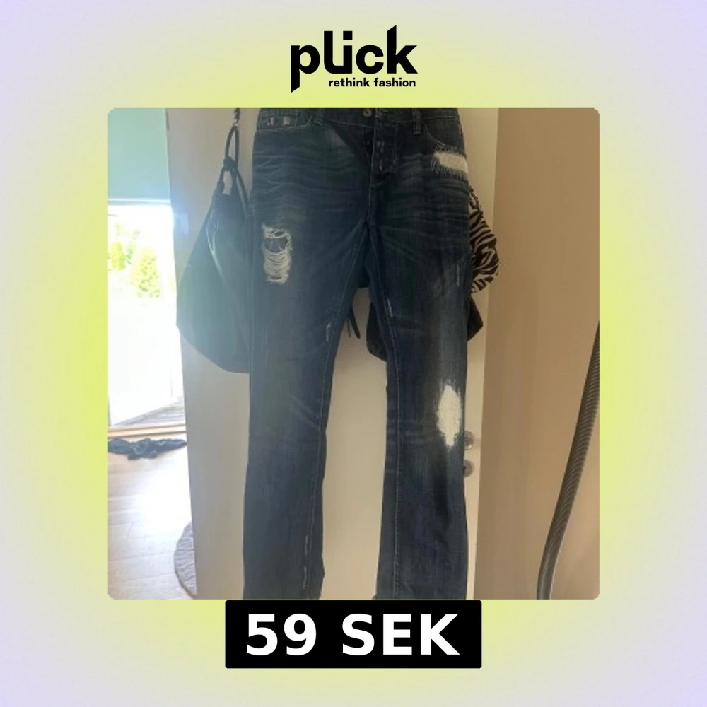 Säljer ett par mörkblå jeans med slitningar och hål på flera ställen. Jeansen har raka ben och klassisk femficksdesign. Super sköna!!💕💕