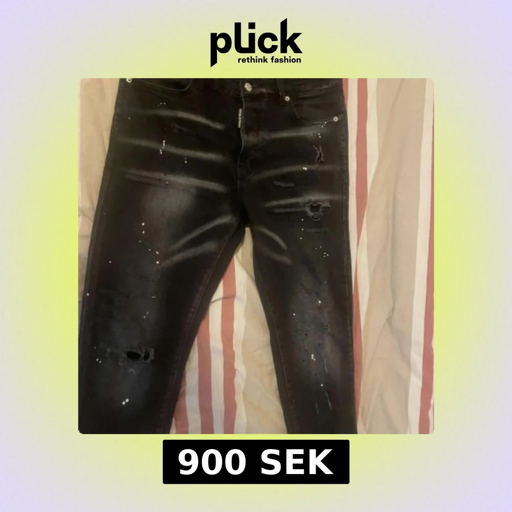 Säljer ett par svarta skinny jeans med coola slitningar och färgstänk. Jeansen har en tight passform och klassisk femficksdesign. Perfekta för dig som gillar en edgy streetstil. Priset kan diskuteras.