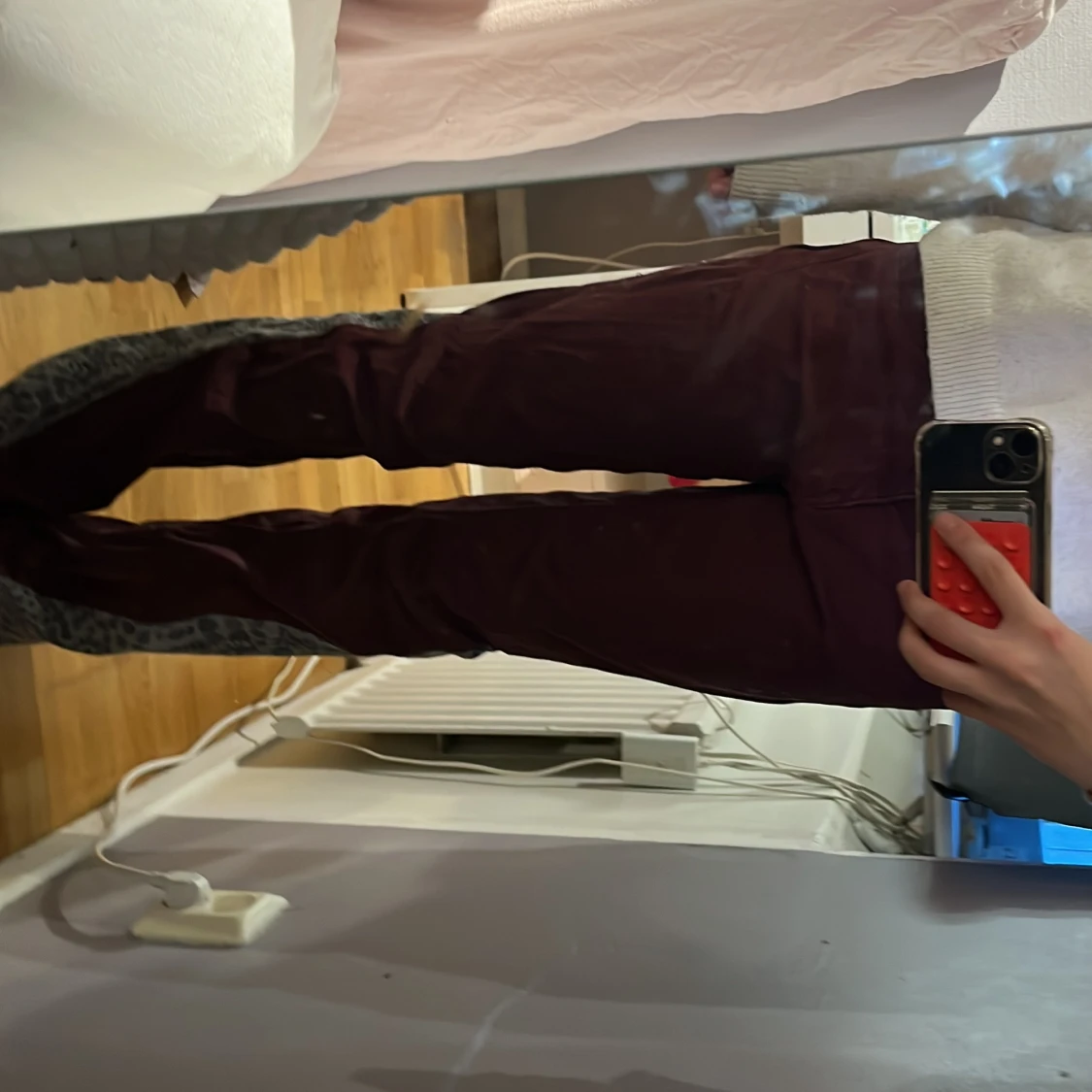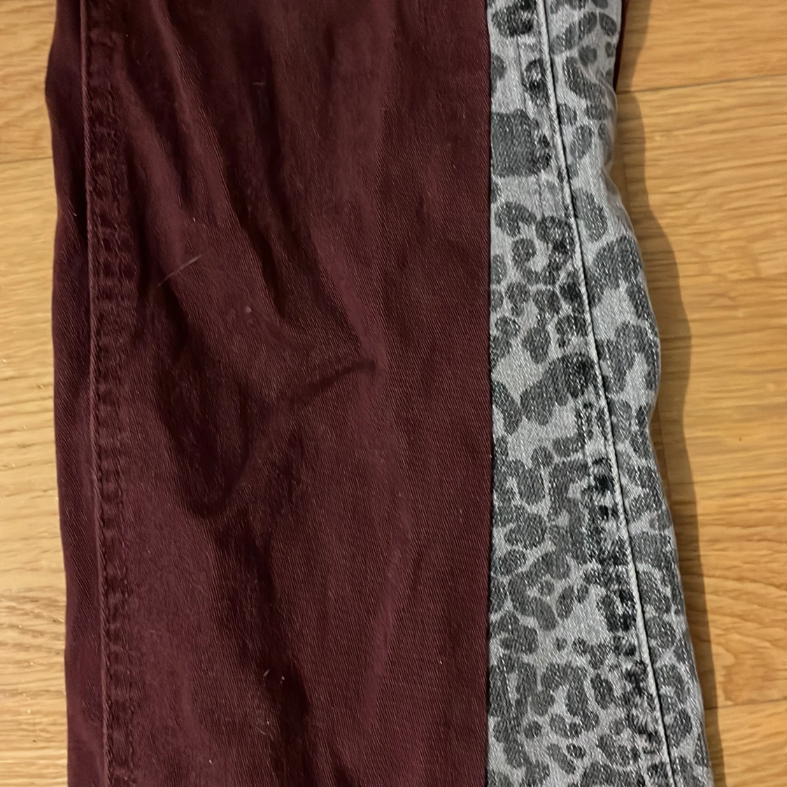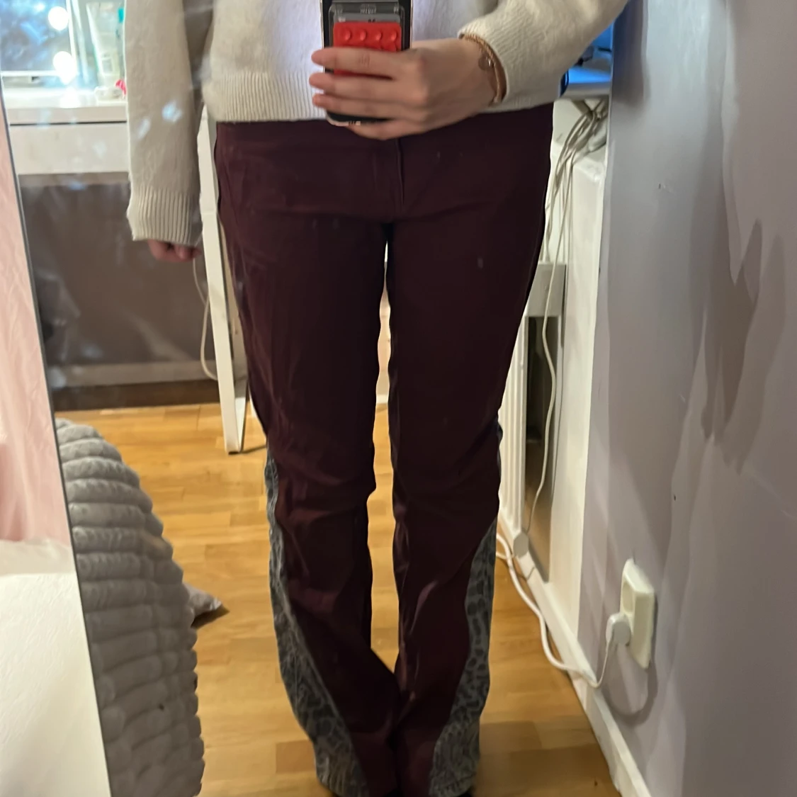 Unika vinröda byxor med utsvänga ben och grå leopardmönstrade paneler längs sidorna. Byxorna har normal passform och är tillverkade i ett mjukt bomullstyg. Perfekta för dig som vill sticka ut med en cool detalj i vardagslooken.