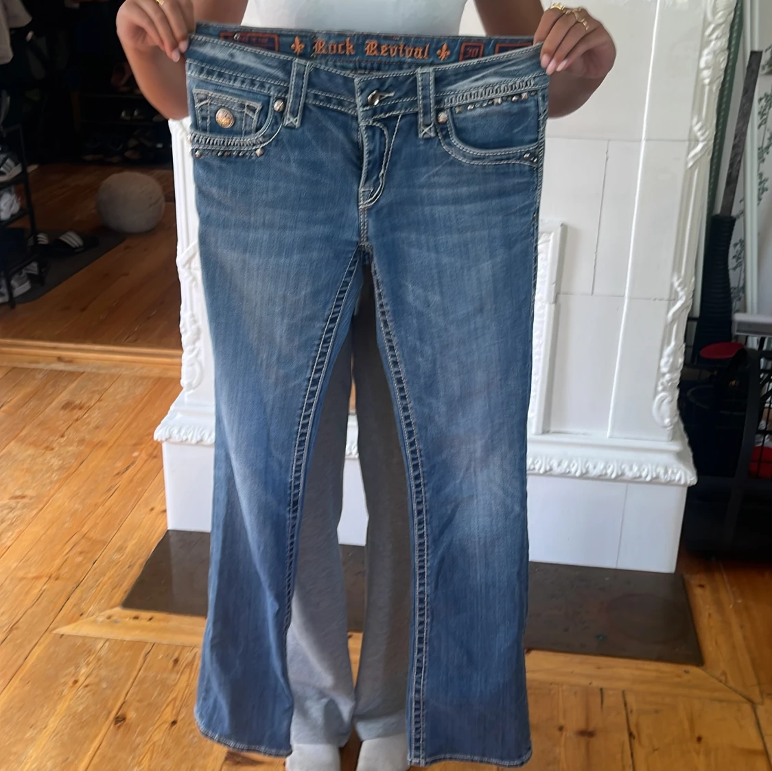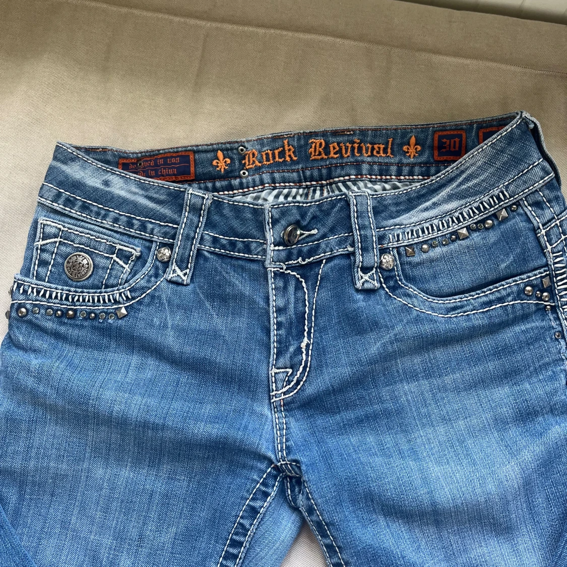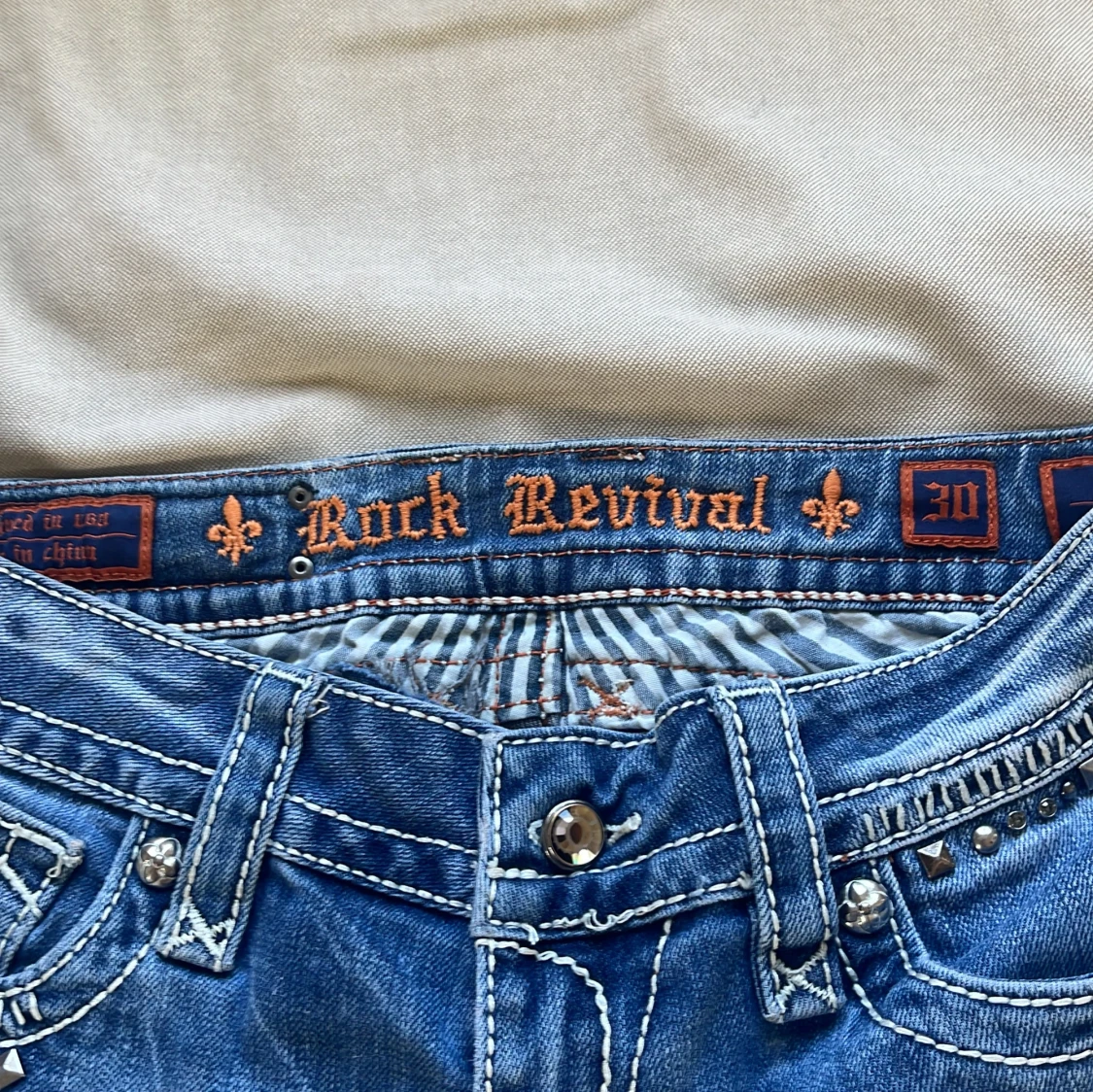 Säljer ett par blå jeans från Rock Revival med vita kontrastsömmar, broderade bakfickor och coola nitar och studs. Lågmidjade bootcut jeans med snygga detaljer och logga på bakfickan. Perfekt för dig som gillar jeans med coola detaljer! Passar någon som har storleken S-M!