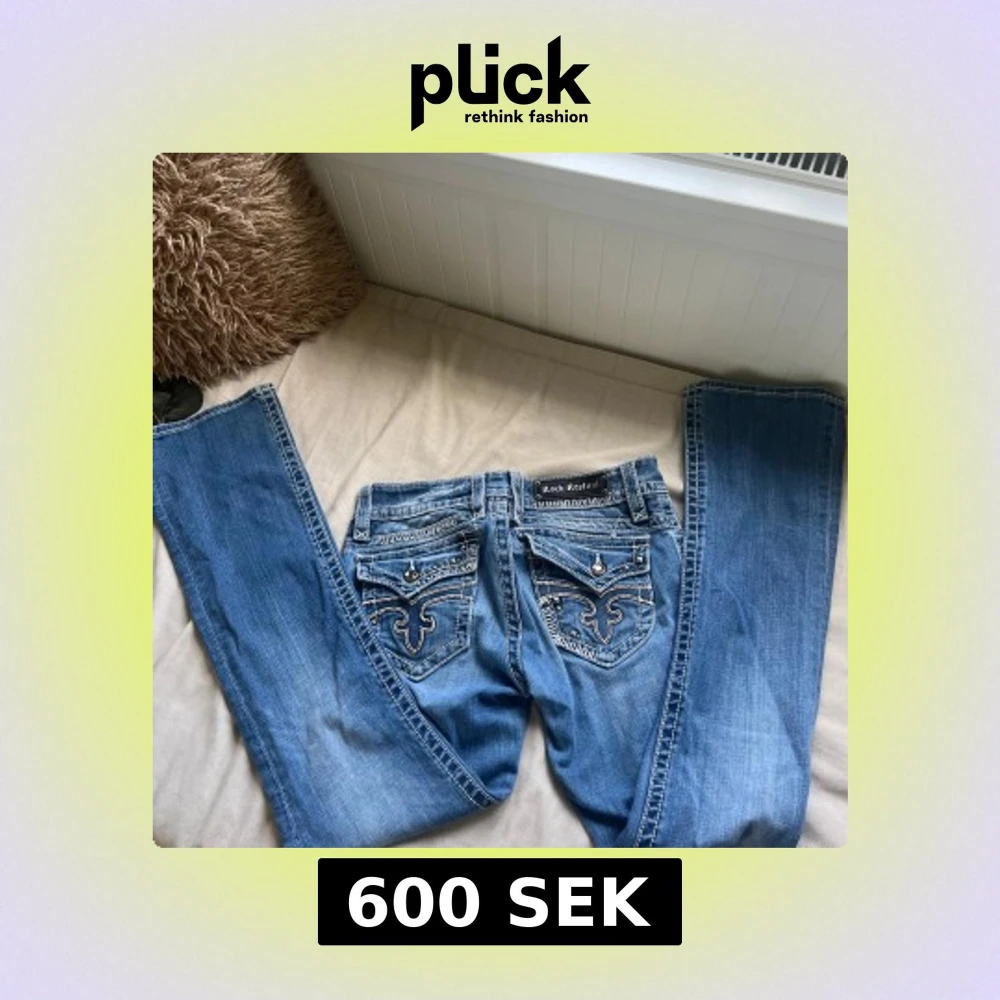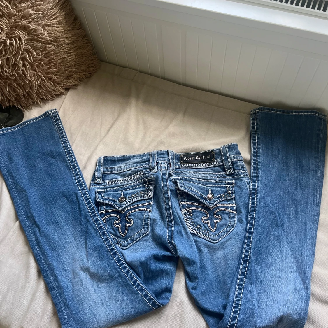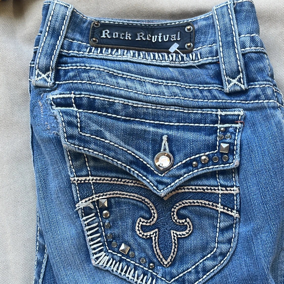 Säljer ett par blå jeans från Rock Revival med vita kontrastsömmar, broderade bakfickor och coola nitar och studs. Lågmidjade bootcut jeans med snygga detaljer och logga på bakfickan. Perfekt för dig som gillar jeans med coola detaljer! Passar någon som har storleken S-M!