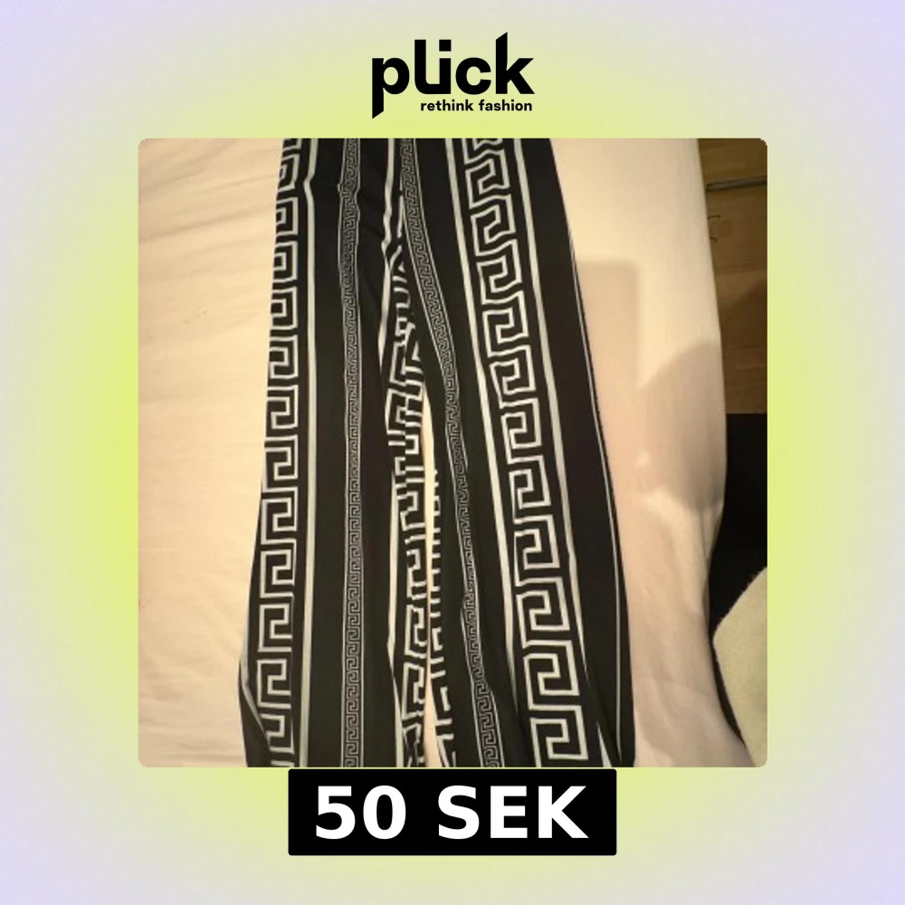 Säljer ett par svarta byxor från Giorgia med feta vita grafiska mönster och raka ben. Byxorna har en cool, nästan grekisk-inspirerad design och är tillverkade i ett mjukt, flowy material som känns skönt mot huden. Perfekta för dig som vill sticka ut med din stil.