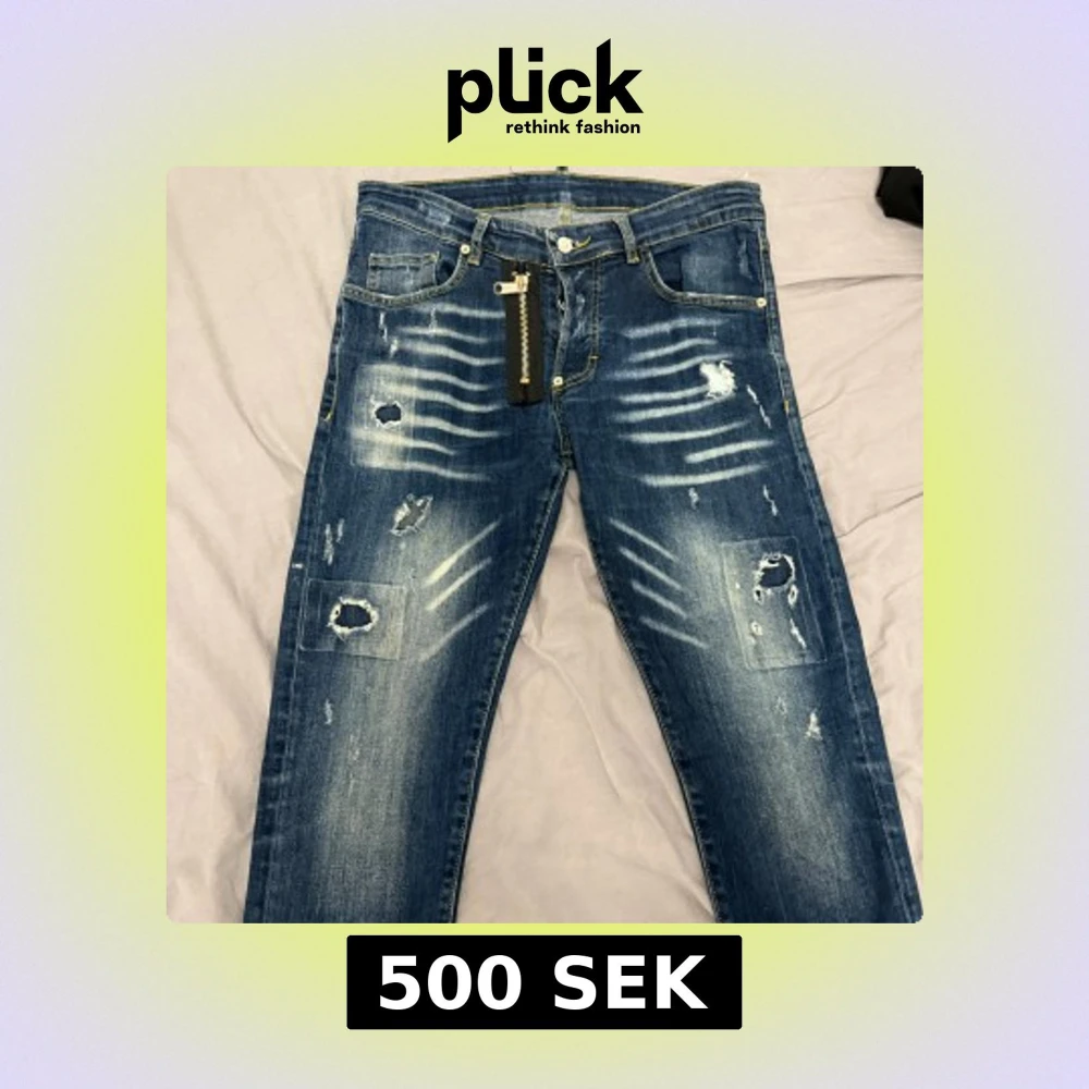 Säljer ett par blå jeans med coola slitningar och patchade hål på benen. Jeansen har en unik dragkedjedetalj vid fickan och snygga ljusa tvättade partier. Perfekt för dig som gillar streetstyle och vill sticka ut med din outfit.