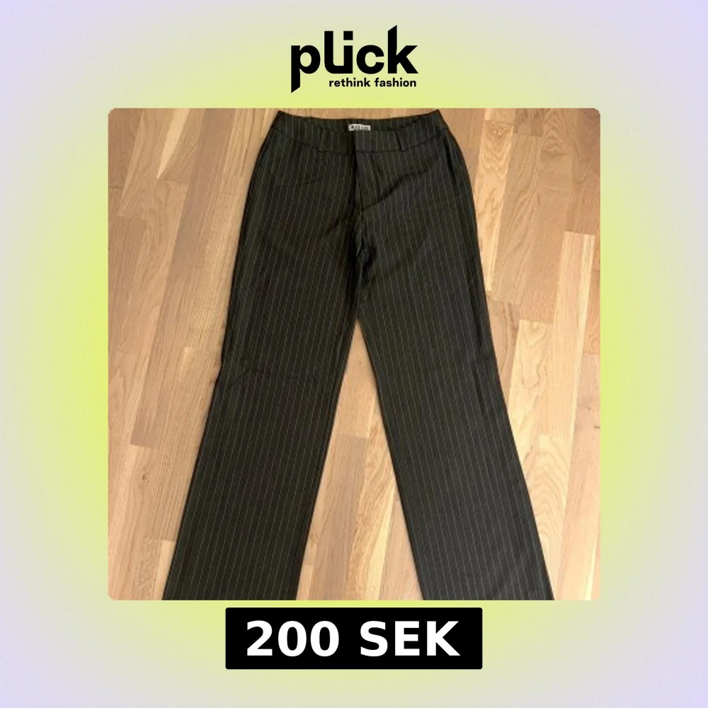 Svarta kostymbyxor från MadLady med tunna vita ränder. Byxorna har liten bootcut och låg midja. Stretchigt och bekvämt material.