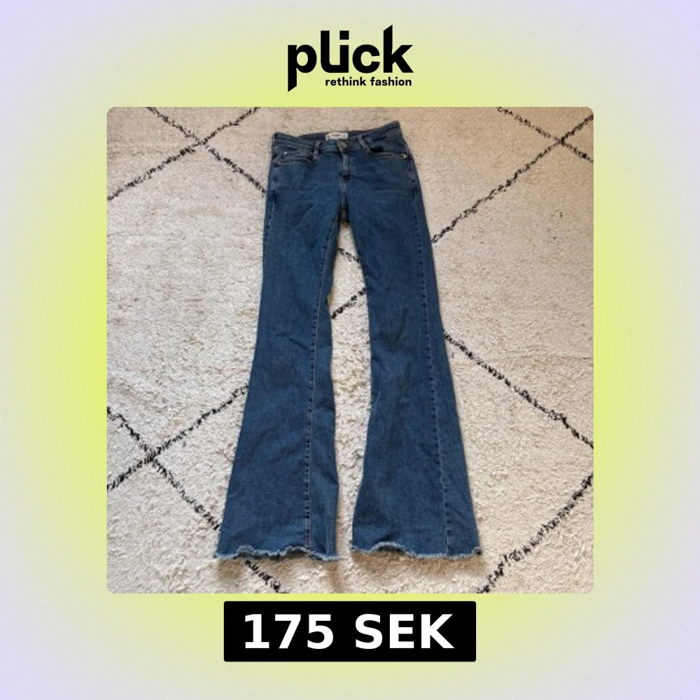 Snygga blå flare jeans från Mango i klassisk denim. Byxorna har utsvängda ben och råa, fransiga benslut för en cool vibe. Femficksmodell med normal passform och midja. Perfekta till sneakers eller boots.