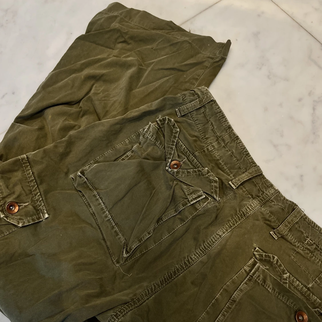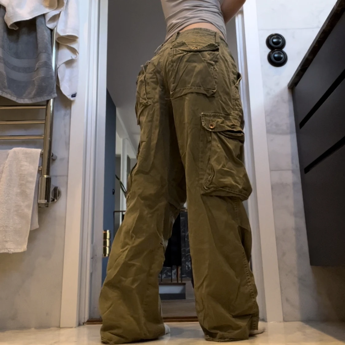 asfeta vintage cargos i militärgrön färg med perfekt oversize passform. sitter som en s/m. midjemått; 88. innerben; 70