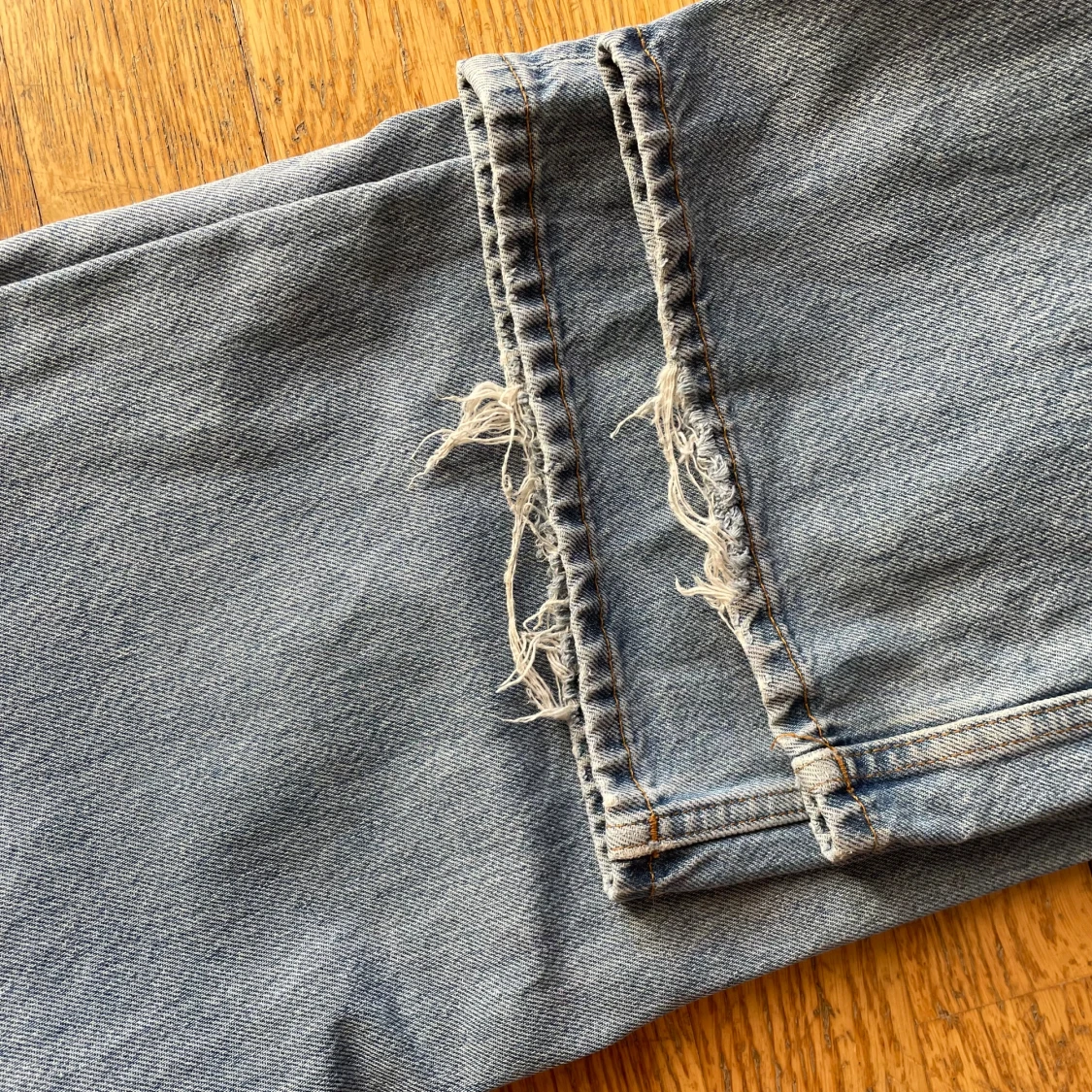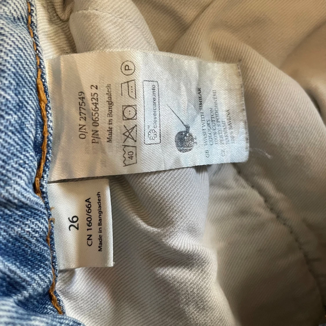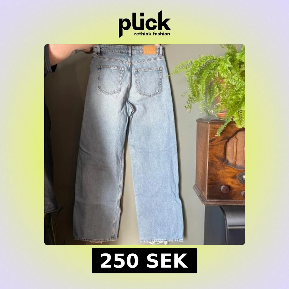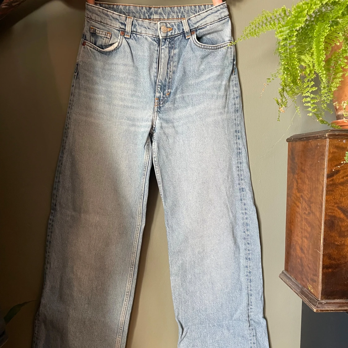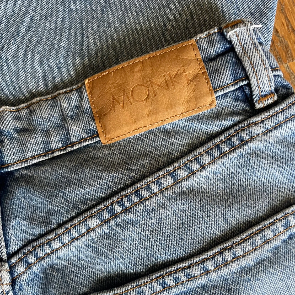 Säljer ett par ljusblå jeans från Monki i storlek 26. Jeansen har raka, vida ben och klassisk femficksdesign. Tillverkade i bomull med snygg tvättad look och råa kanter nertill. Något slitna i nerkanten av byxbenen, se bild, i övrigt i fint skick.