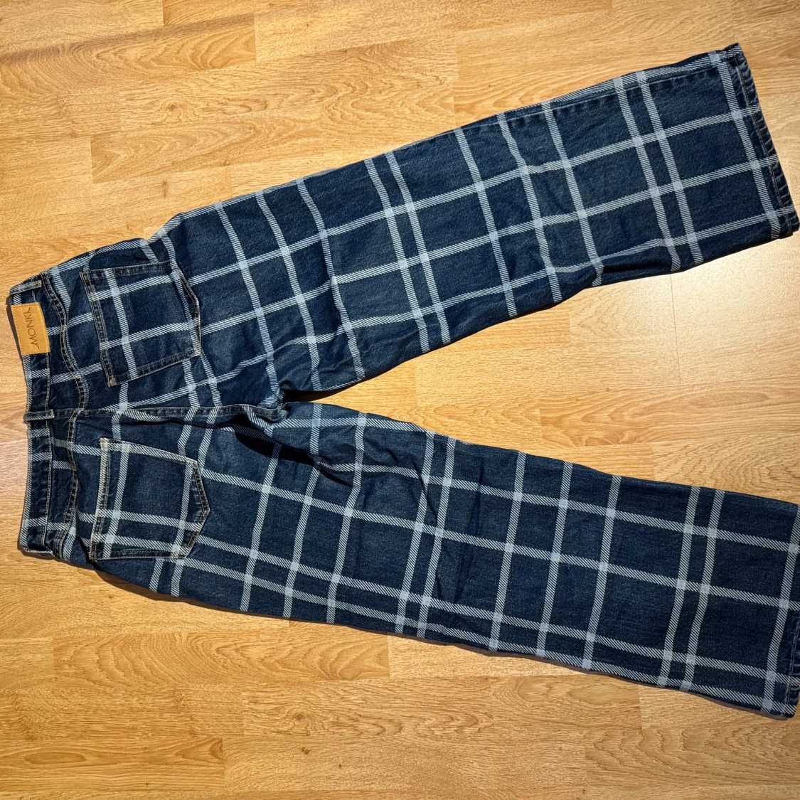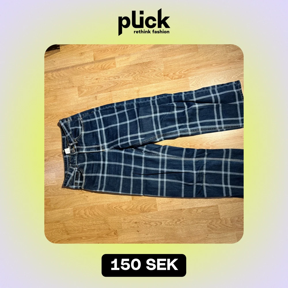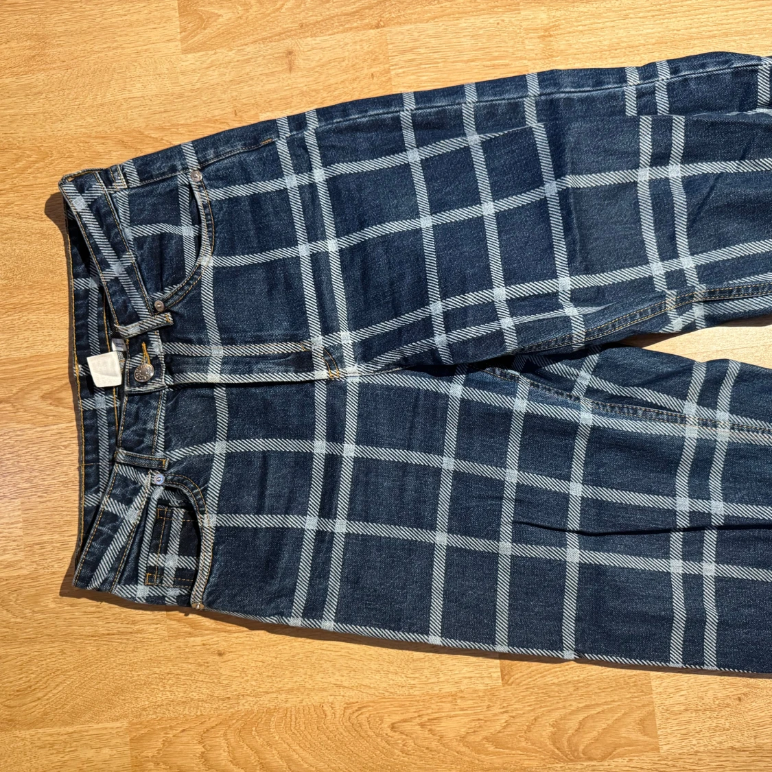 Säljer ett par snygga blå jeans med vitt/ljusblått rutmönster. Supersnygga byxor jag har älskat men de har blivit för små för mig o därför jag säljer vidare. Byxorna har en klassisk femficksdesign och knappar i silverfärg. Perfekta för en avslappnad