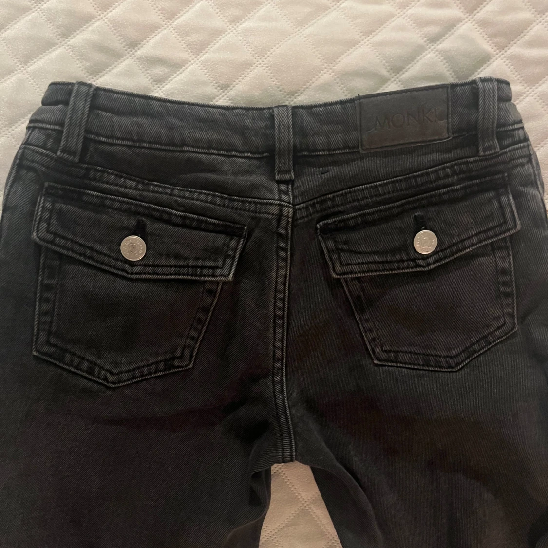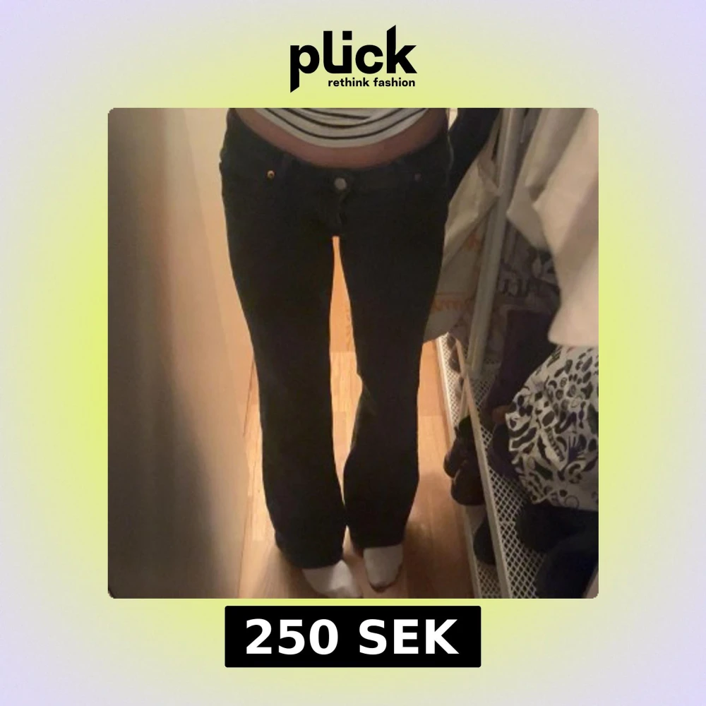 Säljer ett par svarta bootcut jeans 💗 De är low waist med knappfickor därbak 💗 Storlek XS/24 och har använts fåtal gånger med mycket bra skick🫶