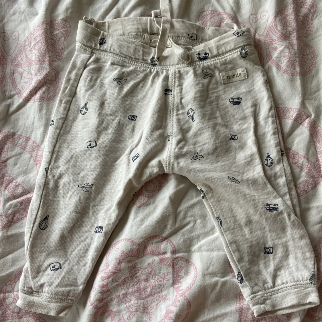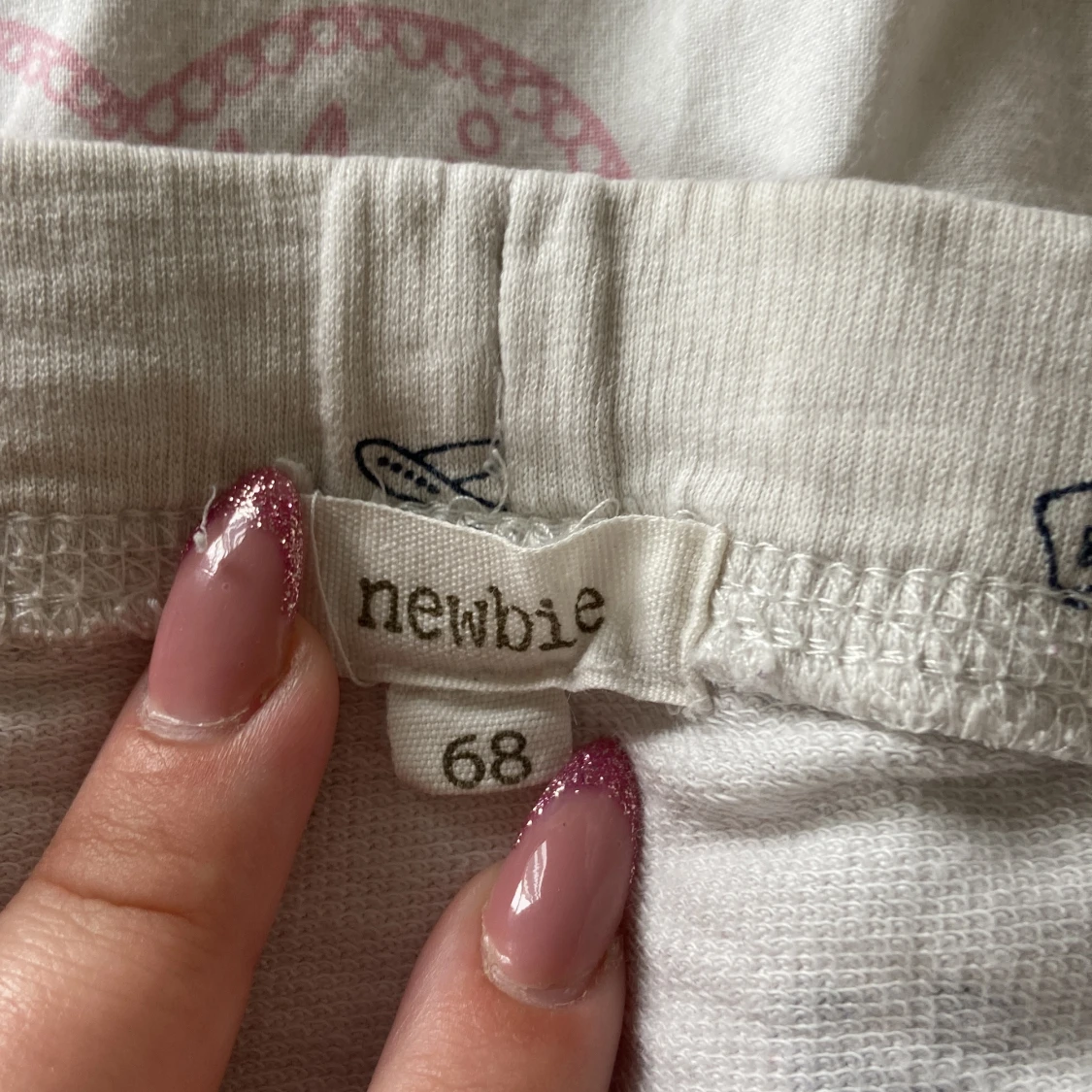 Supersöta ljusa byxor från Newbie i storlek 68, med små blå mönster av luftballonger, flygplan och kameror. Byxorna har resår i midjan och är gjorda i mjuk bomull, perfekta för små äventyrare.
