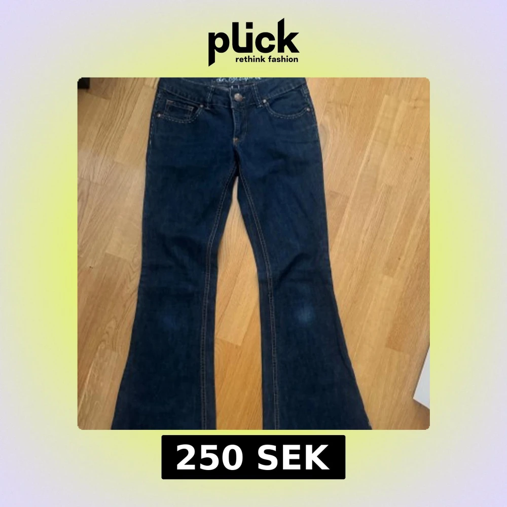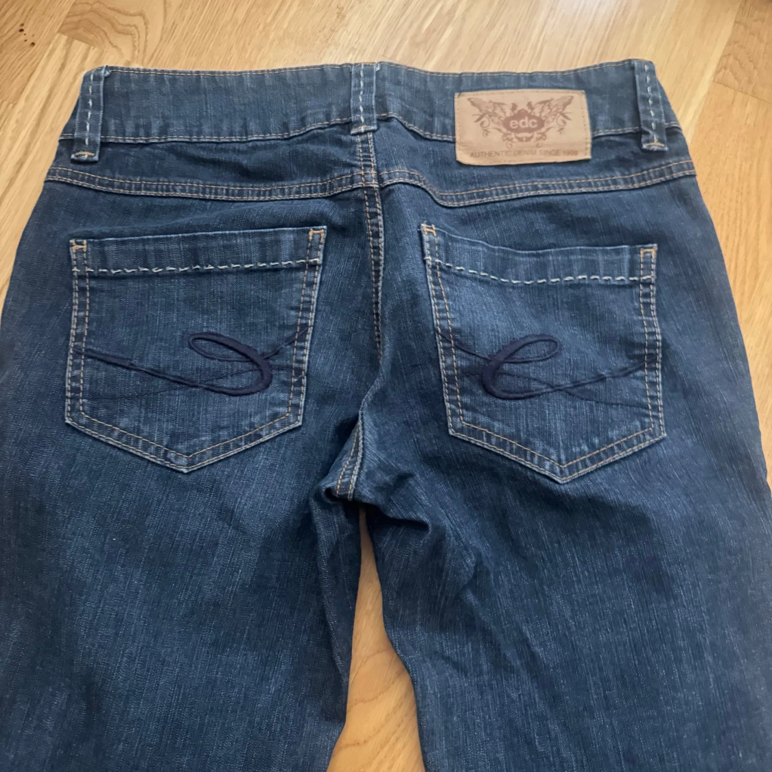Snygga mörkblå jeans från EDC med bootcut passform och klassiska kontrastsömmar. Bakfickorna har broderade detaljer och ett läderpatch med logga i midjan. Perfekta för dig som gillar en retro vibe och vill ha ett par jeans med lite extra sväng i benen. Storlek 26/32