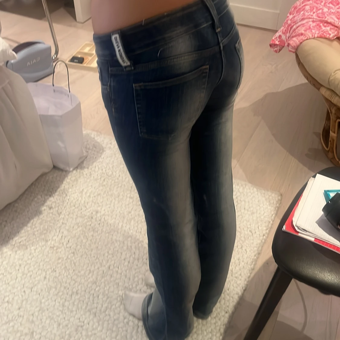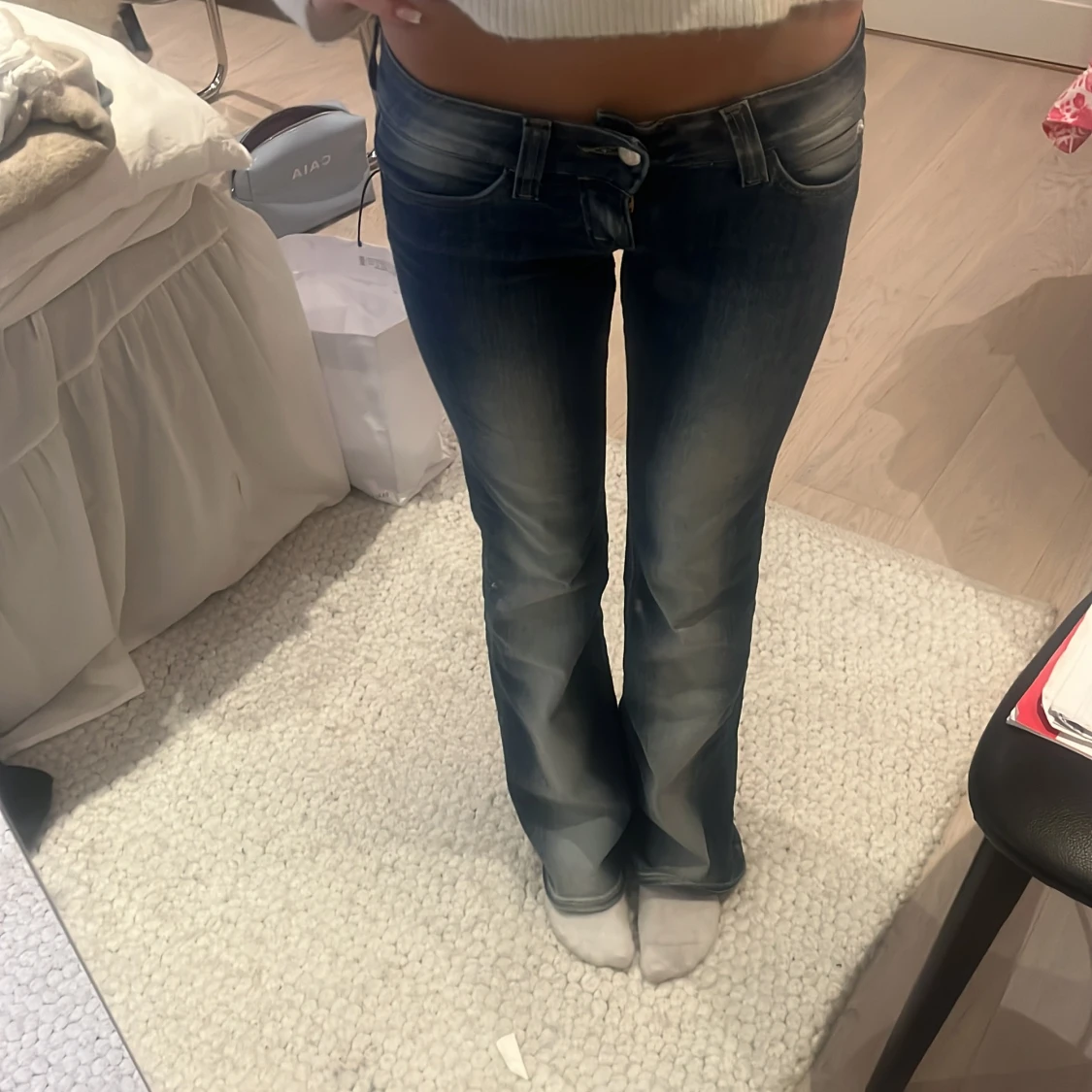 Snygga mörkblå bootcut jeans från weekday med låg midja och klassisk femficksdesign. Jeansen har slitningar och ljusare i mitten på jeansen båda fram och bak. Skriv vid frågor och funderingar!💕