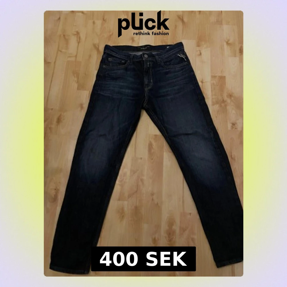 Säljer ett par mörkblå jeans från Replay med klassisk femficksdesign och snygga detaljer på bakfickorna. Jeansen har rak passform och är tillverkade i slitstarkt denim-material. Perfekt för dig som gillar stilrena och tidlösa jeans.