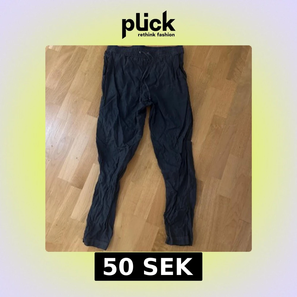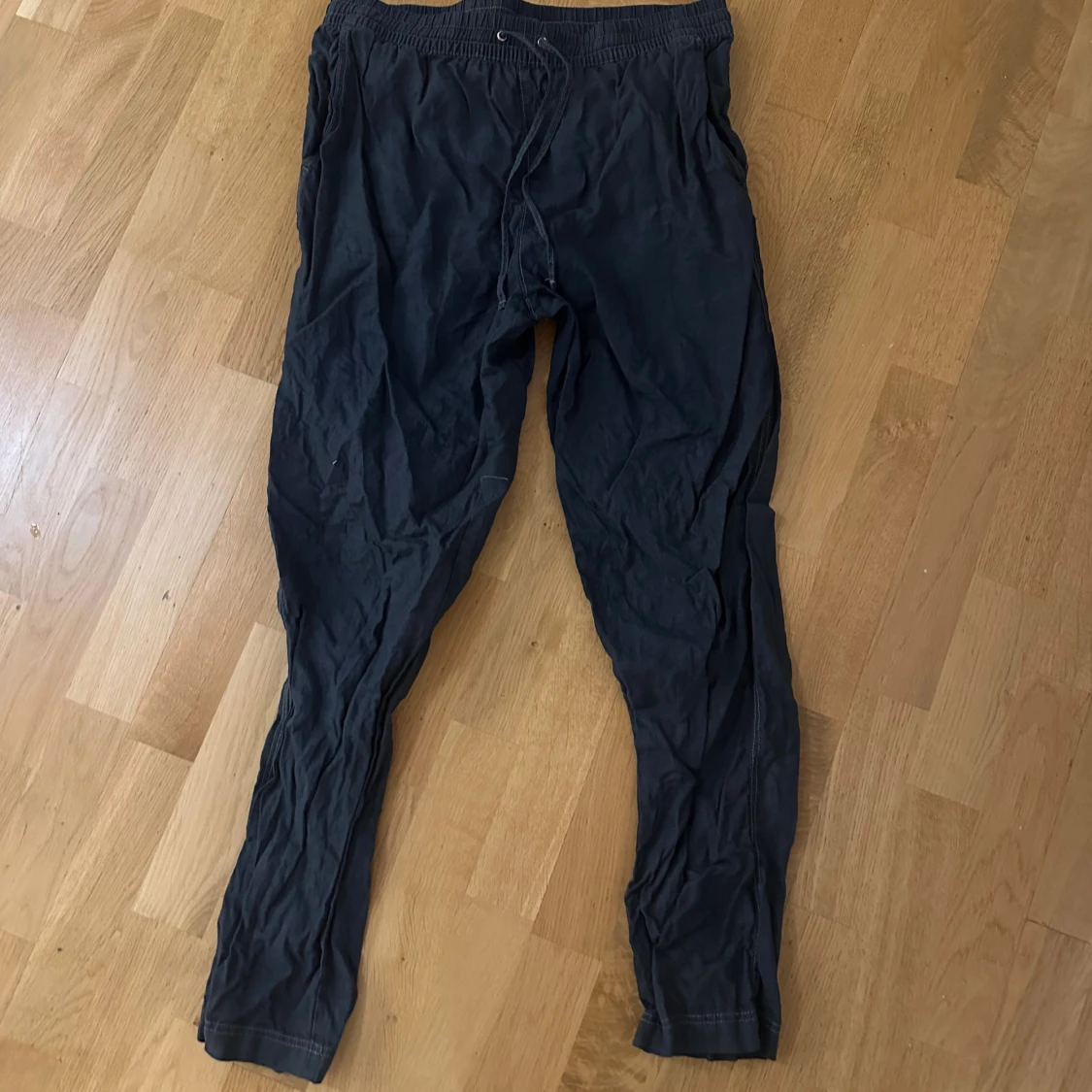 Mörkblå linnebyxor från H&M i 100% bomull. Byxorna har elastisk midja med snörning och raka ben. Perfekta för en chill och avslappnad stil. Snygga att matcha med en hoodie eller t-shirt.