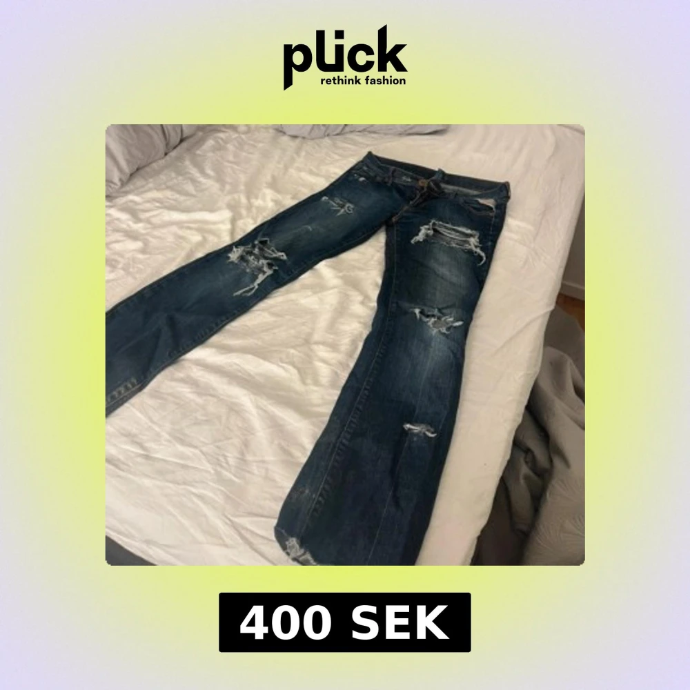 Säljer ett par mörkblå jeans från Replay med slitningar och hål på både fram- och baksida. Säljer då de tyvärr var lite för långa. Midjemåttet är 38,5 cm, innerbenslängden är 78 cm och grenhöjden är 19 cm.