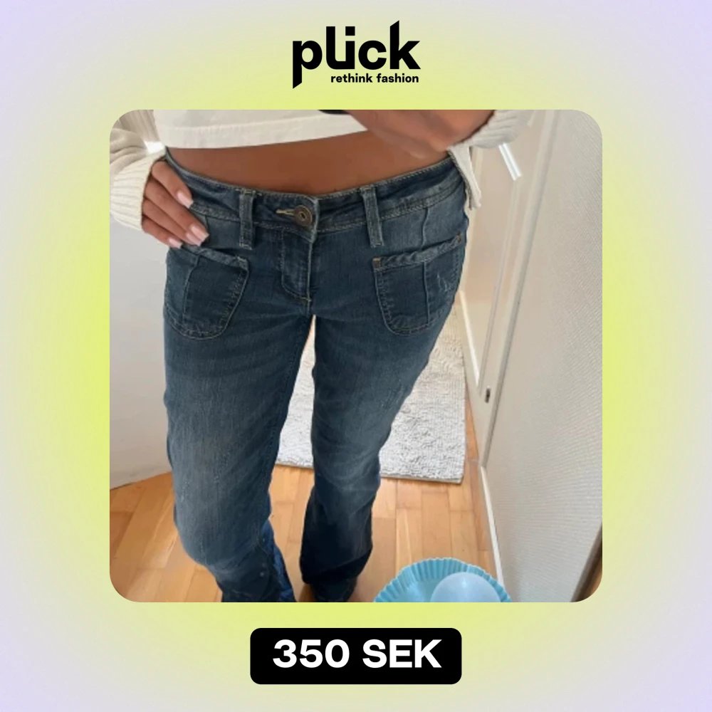 Säljer ett par fina mörkblåa jeans med snygga fickor på framsidan. De är i bra skick 💗Det står att de är i storlek 32 men de sitter mer som 34/36