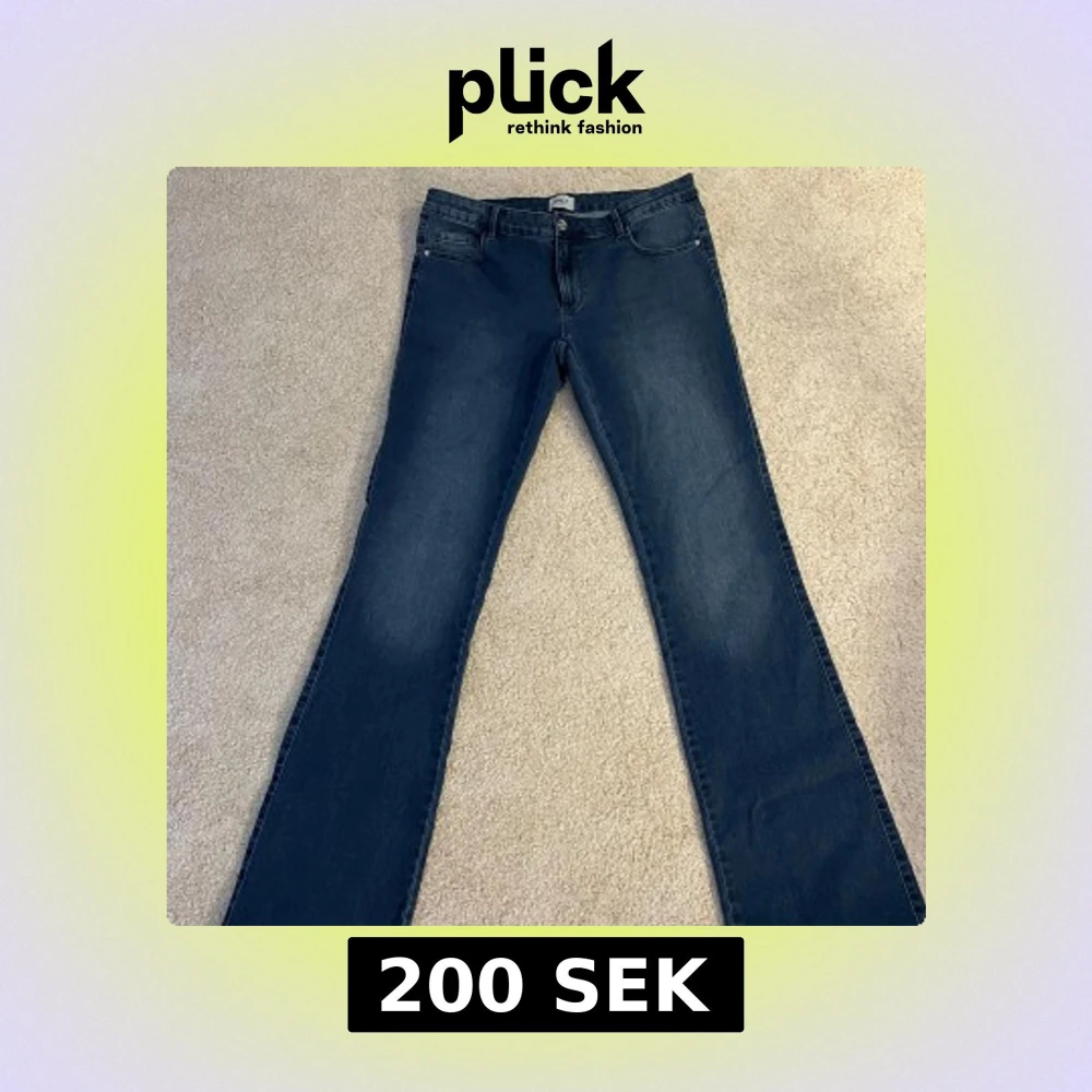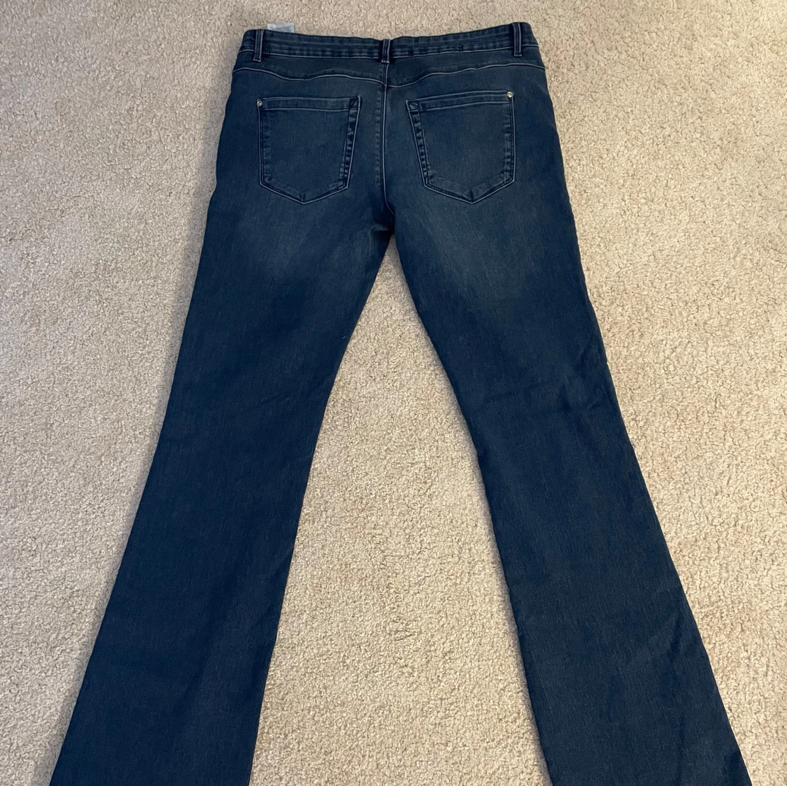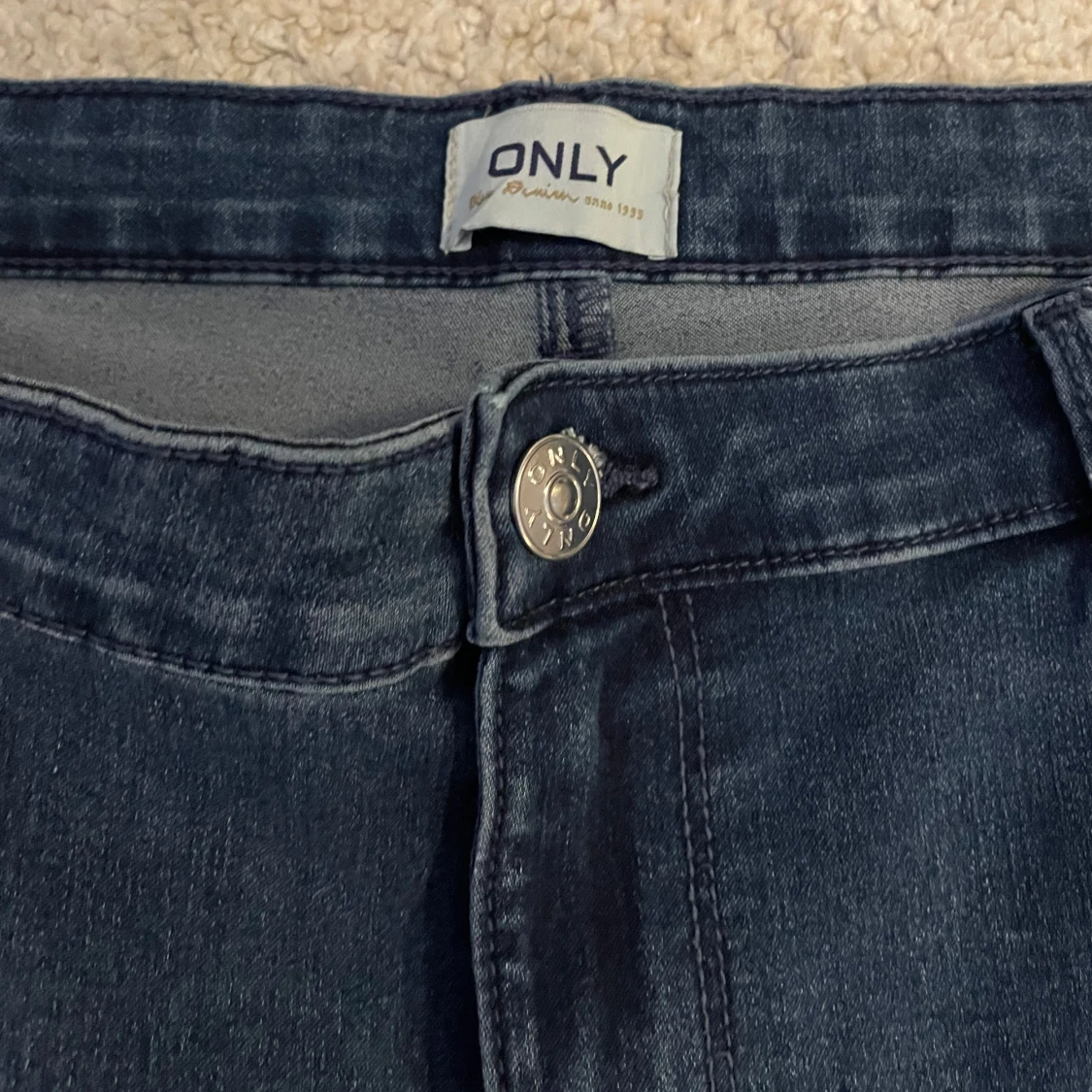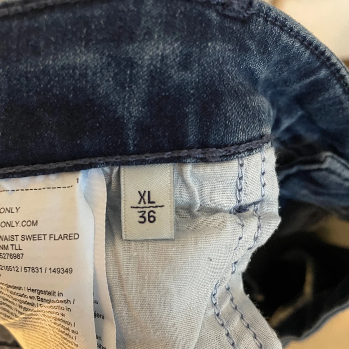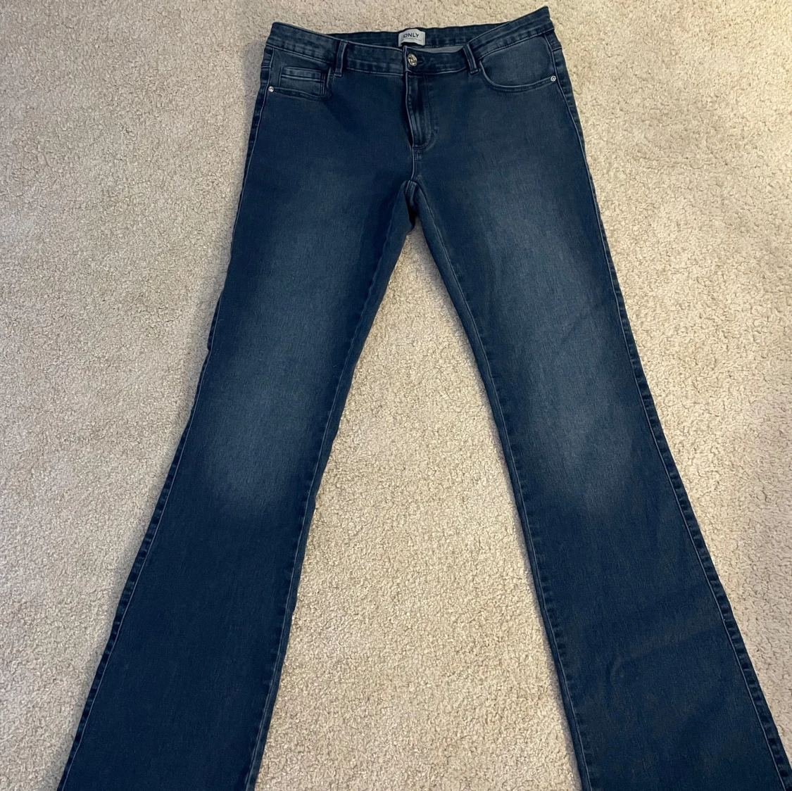Snygga mörkblå jeans från ONLY med en klassisk femficksdesign. De har en knapp och dragkedja framtill och är i modellen 'Sweet Flared' vilket ger en trendig look. Dom är i mycket bra skick och är aldrig använda.