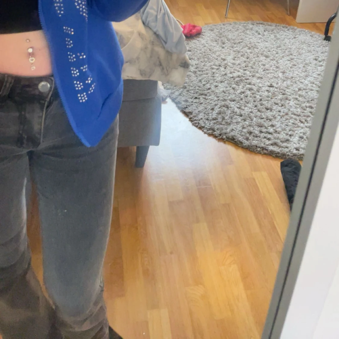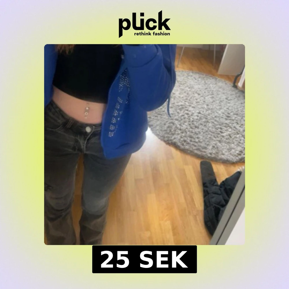 Säljer ett par mörkgrå jeans med bootcut passform och låg midja. Jeansen har klassisk femficksdesign och knappstängning framtill. Perfekta för dig som gillar en avslappnad och trendig stil.