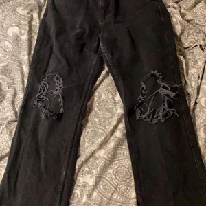 Ett par svarta straight jeans med hål på knäna från NA-KD, dom är i riktigt jeans material vilket innebär att dom inte är så stretchiga, men otroligt sköna och snygga! Säljer dom eftersom dom inte passar längre. Nypris ca 300kr💞 Du står själv för frakten💞