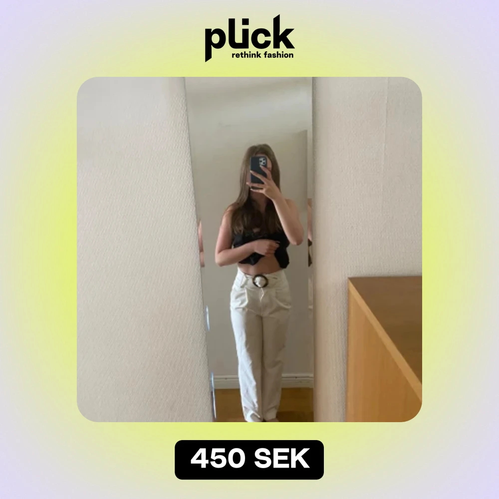 Ett par vita byxor från NA-KD i storlek 32. Byxorna har en hög midja och ett bälte med ett runt spänne. De har en normal passform och är tillverkade i ett bekvämt material. Går att göra till lågmidjade om man vill. Original pris 800kr💕