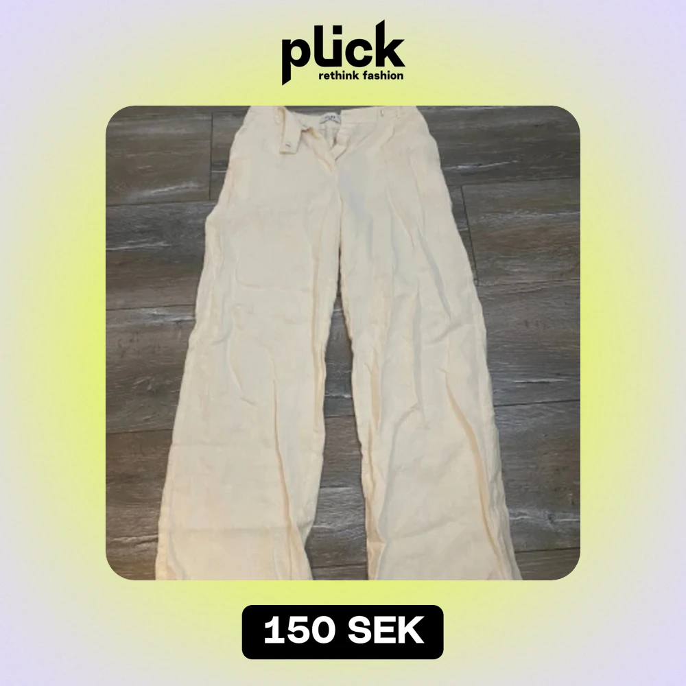 Vita kostymbyxor med bootcut - Snygga vita kostymbyxor med bootcut-snitt och låg midja. Byxorna har klassiska fickor fram och stängs med dragkedja och knapp. Materialet känns som bomull eller polyester och de har en clean, fräsch look som är lätt att matcha med olika toppar. Lite noppiga på vissa ställen.