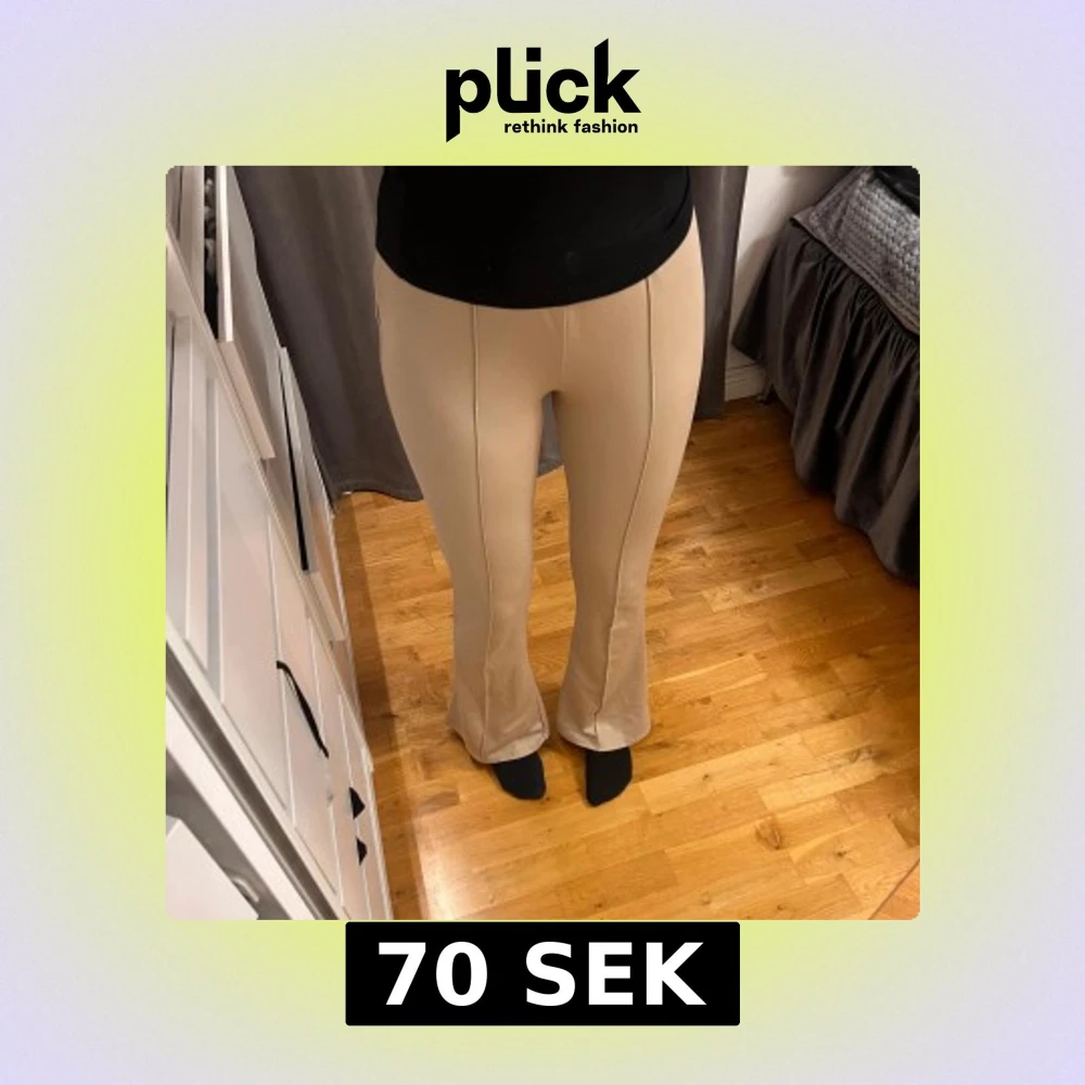 Snygga beiga bootcut-byxor från NA-KD med markerade sömmar framtill. Byxorna har hög midja och är tillverkade i ett mjukt, stretchigt material som sitter bekvämt. Perfekta för en trendig och stilren look. Storlek M men passar även mig som vanligtvis bär Xs-S, de sitter dock lite lösare.