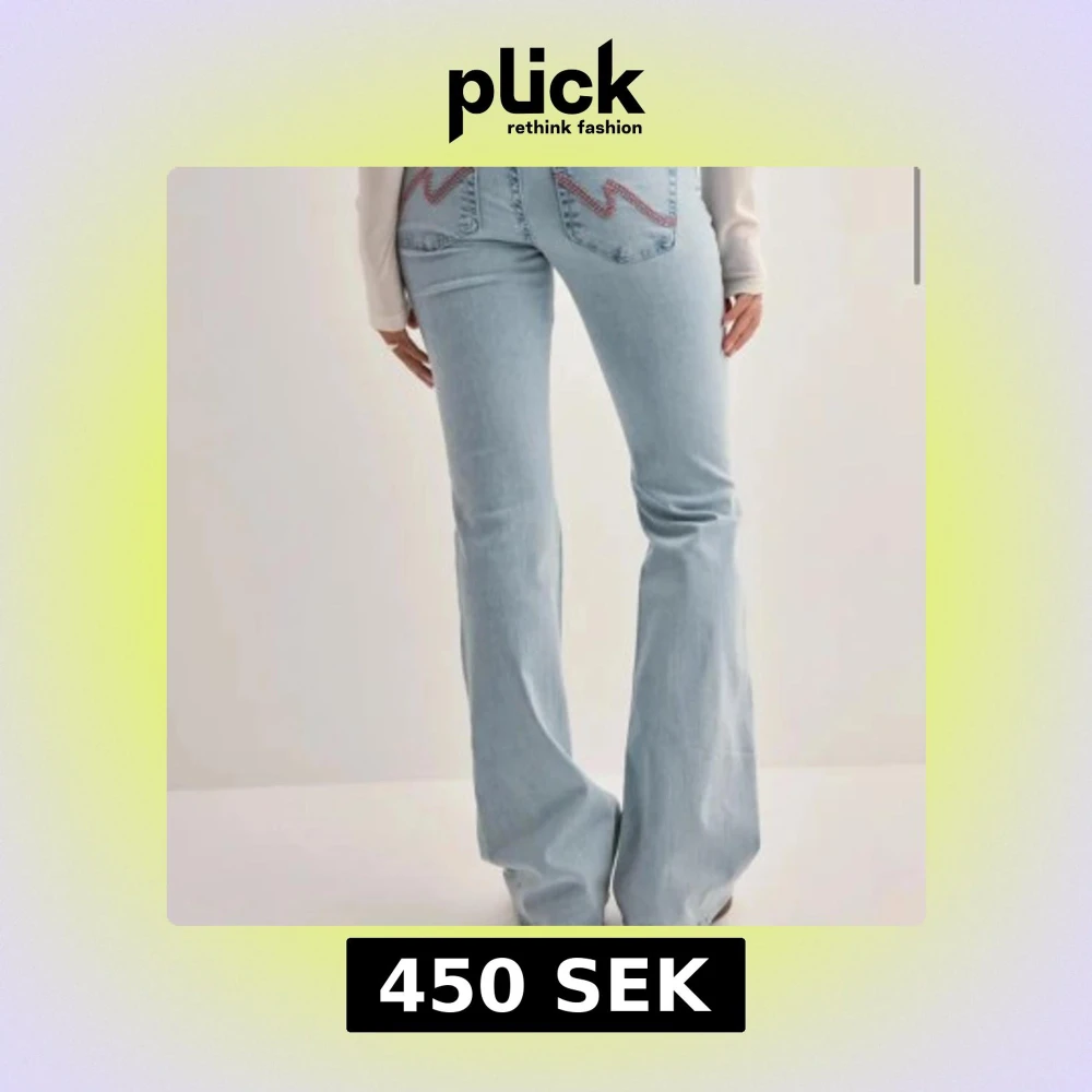 Säljer ett par ljusblå bootcut jeans med slitna knän och broderade detaljer på bakfickorna. Jeansen har klassisk femficksdesign och är tillverkade i denim. ( dom är lite slitna längs ner då dom är vite långa på mig 166)