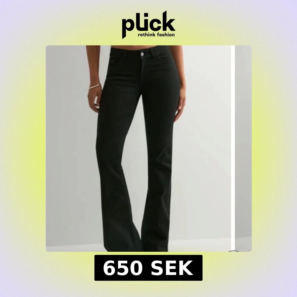 Snygga svarta jeans med bootcut passform och låg midja. Klassisk femficksmodell med knapp och dragkedja framtill. Jeansen har stilrena bakfickor med diskret broderad detalj.