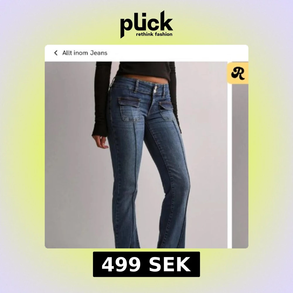 Snygga blåa boot cut jeans med fickor framtill. Jeansen har klassisk midja och markerade sömmar längs benen för en cool look.