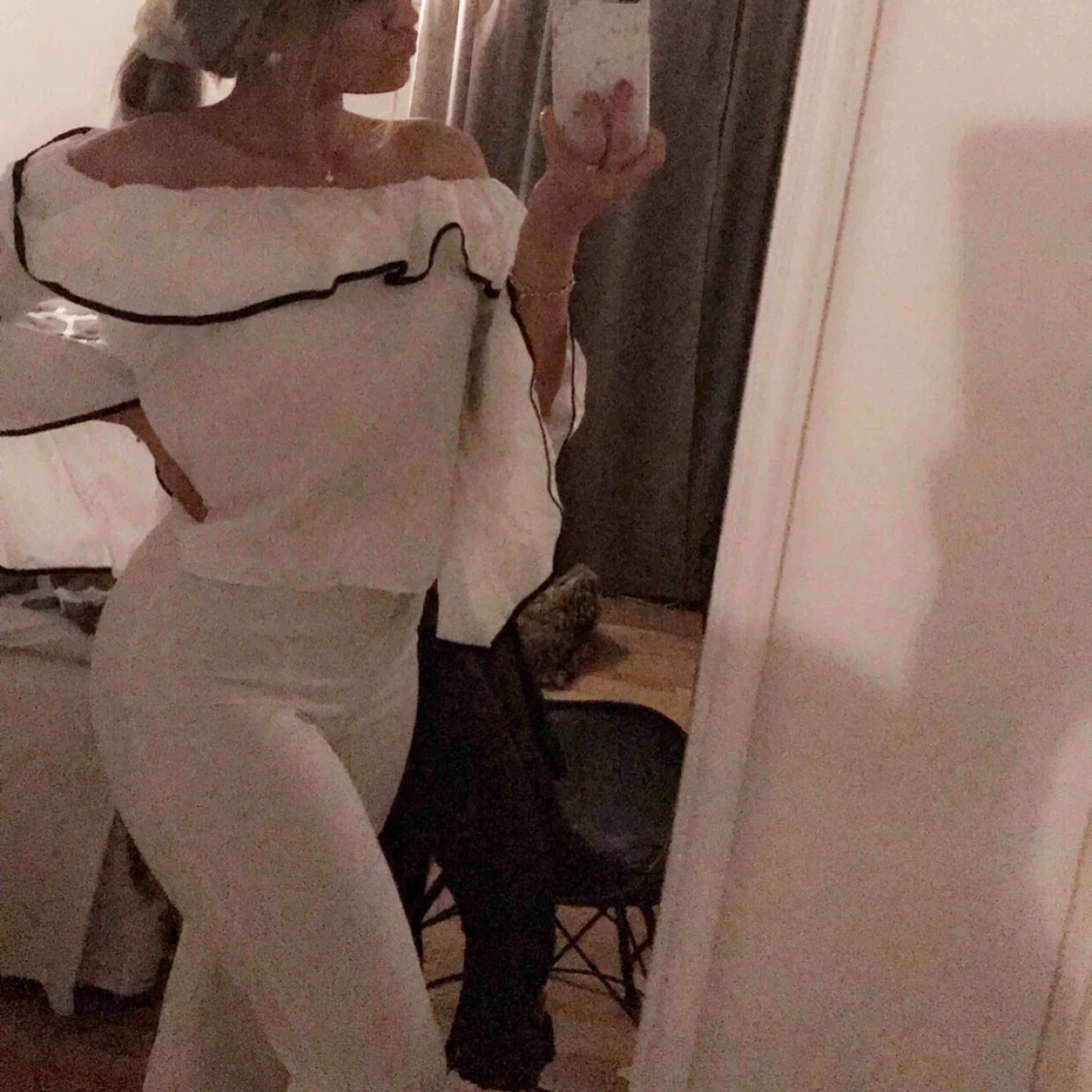 Vita utsvängda byxor som aldrig kommer till användning