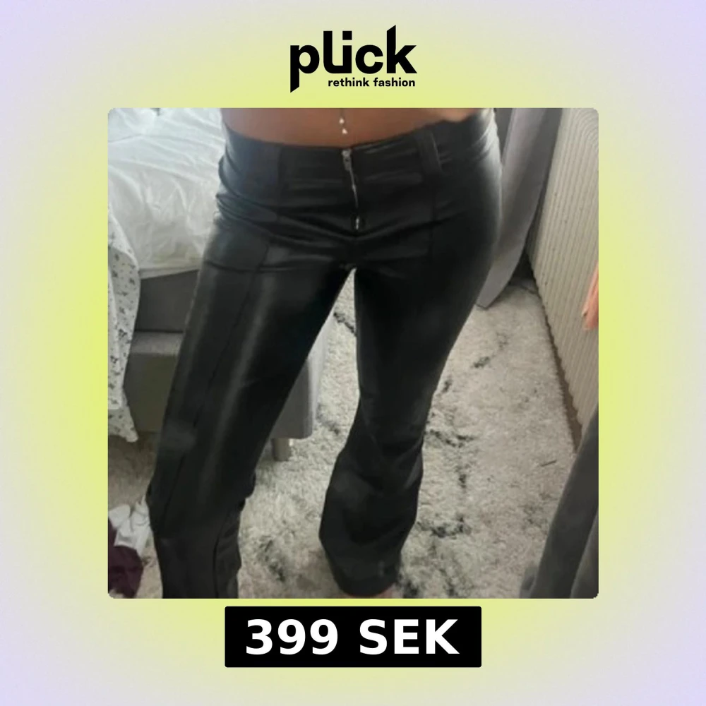 Snygga svarta byxor i skinnimitation med bootcut passform och låg midja. Byxorna har dragkedja och knapp framtill samt markerade sömmar längs benen. Perfekta för en edgy och trendig look.