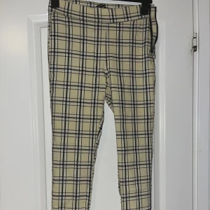 Väldigt stretchiga gulsvarta rutiga kostymbyxor men dragkedja åt sidan. Inte tajt alls vid midjan och långa byxben!