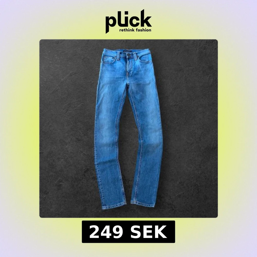 Säljer ett par klassiska blå skinny jeans från Nudie Jeans med snygga kontrastsömmar och ikonisk logga på bakfickan. Modellen har hög midja och raka ben med smal passform. Perfekt för dig som gillar stilrena och tidlösa jeans.