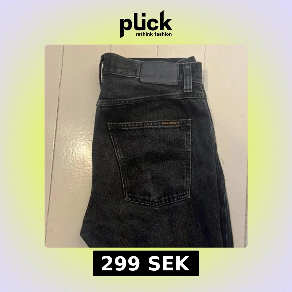 Snygga svarta jeans från Nudie . Jeansen har silverfärgade och kopparfärgade nitar, samt Nudie Jeans-logga på bakfickan. Perfekta för dig som gillar en stilren och tidlös look. Aldrig använda