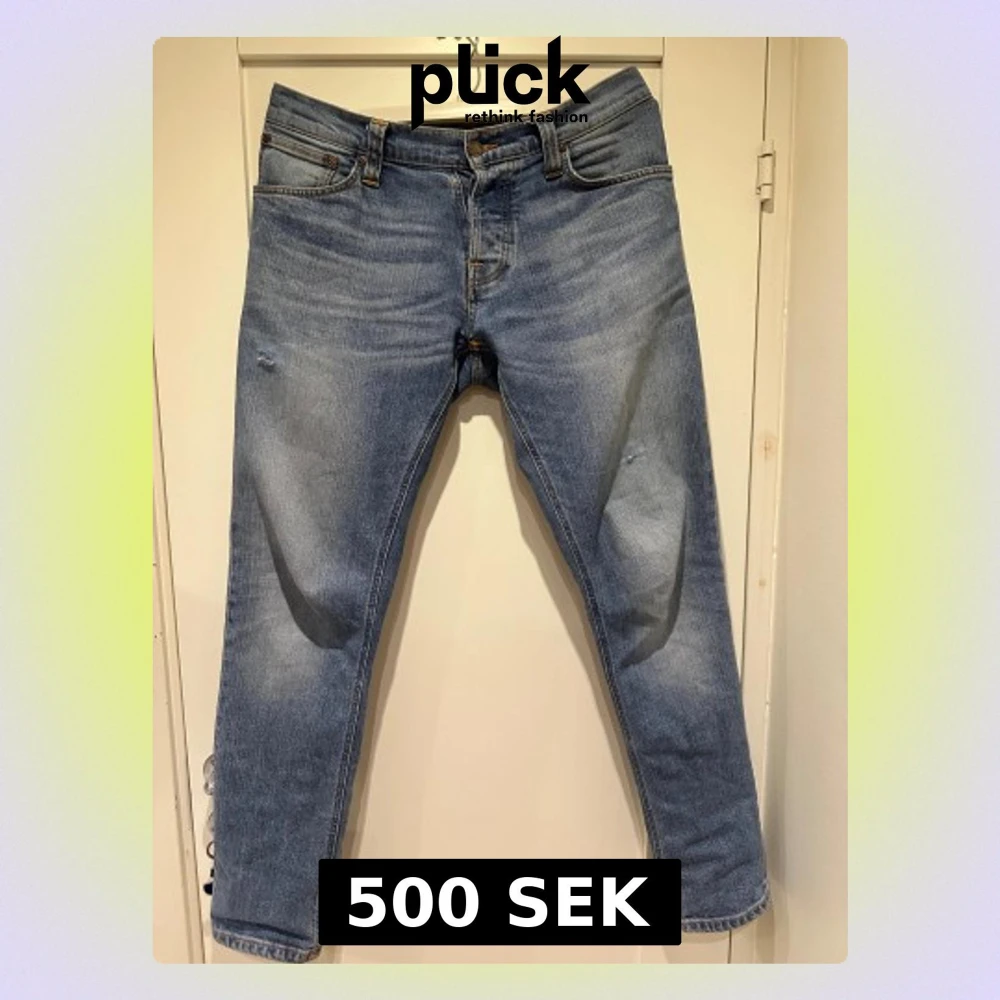 Säljer ett par ljusblå jeans från Nudie Jeans i storlek W32 L32. Det är modellen Grim Tim. Jeansen har klassisk femficksdesign, orangea sömmar och en rak passform. Tillverkade i mjukt denimtyg med snygga slitningar och subtila detaljer för en avslappnad look.