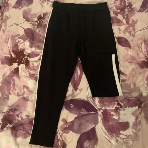Stilrena mjukisbyxor, byxor från ONLY. Storlek M, längd 32. Passar även S. 🥰 Svart färg. Vita detaljer på sidan av benen. Man kan ha skärp till även om man vill det. Bra skick! Frakt tillkommer. (57 kr) 🤍