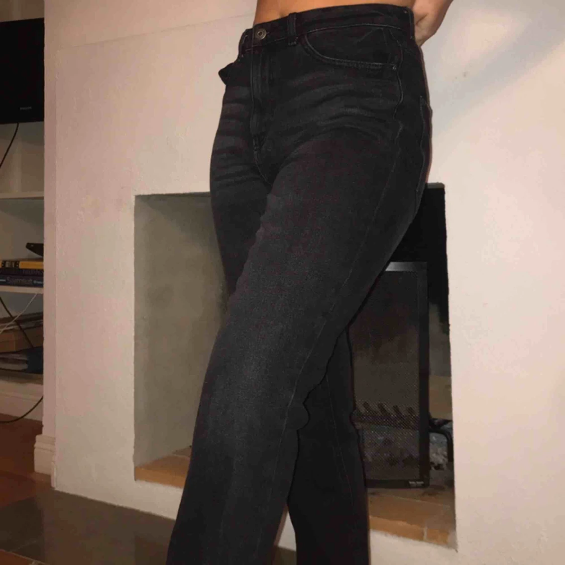 Säljer p.g.a modellen inte passar på mig. Svart/gråa jeans supersnygga till hösten. Raka i modellen, midjan 28 och längden 32!