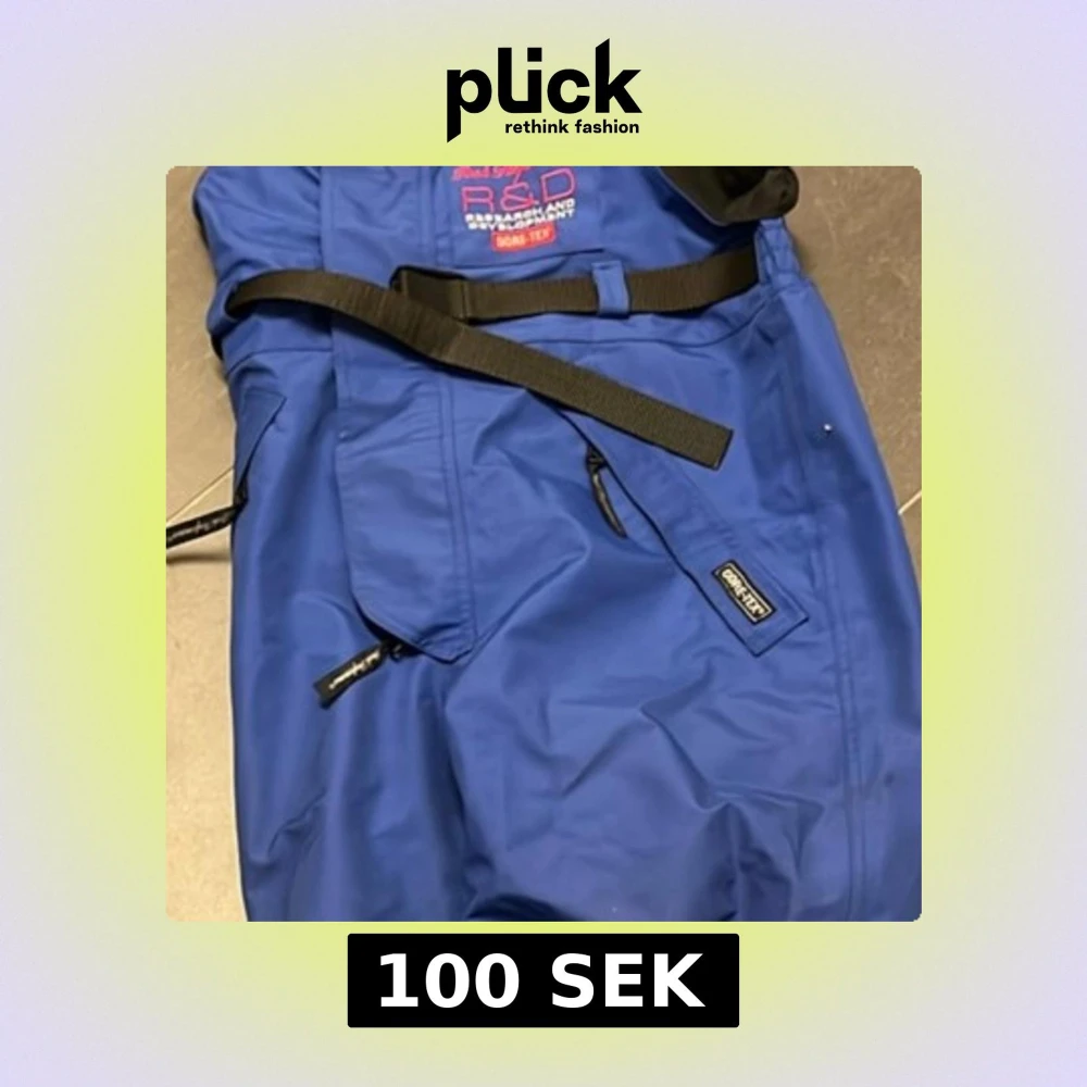 Vintage 80-tal, blå skid/täckbyxor från Peak Performance med svarta hängslen och bälte i midjan. Byxorna är tillverkade i slitstarkt Gore-Tex-material och har flera dragkedjeförsedda fickor. Perfekta för vinterns alla äventyr och outdooraktiviteter.