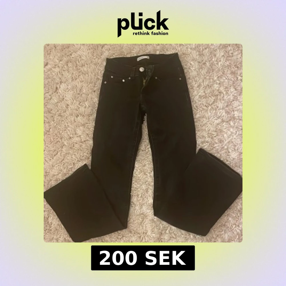 Svarta jeans från Perfect Jeans i storlek 32 med bootcut passform. Klassisk femficksdesign med snygga silverfärgade knappar på bakfickorna och dragkedja framtill. Jeansen har normal midja och är tillverkade i ett mjukt jeansmaterial. Väldigt low waist.