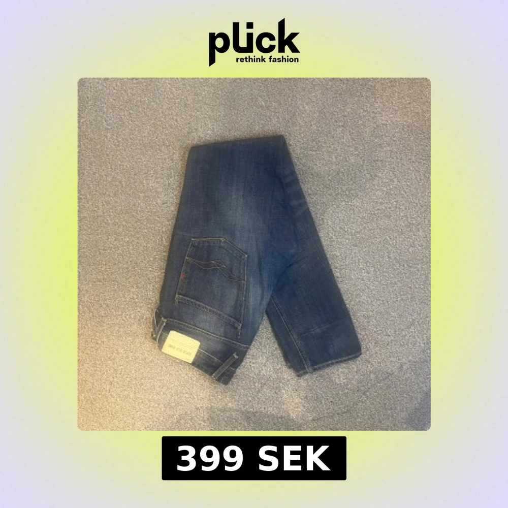 Replay Anbass jeans i storlek W28/L32. Mörkblå denim med skön passform och lite stretch som gör dem bekväma. Bra skick utan hål eller fläckar, bara lite slitningar. Nypris runt 1500–2000 kr. Mått: A (midja): 43 cm B (lårvidd): 27 cm C (fotvidd): 16 cm D (innerbenslängd): 80 cm Säljes för 399 kr.