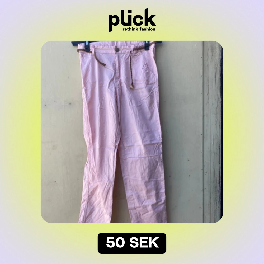Säljer ett par ljusrosa byxor i storlek M. De har en avslappnad passform med snörning i midjan och knappar framtill. Perfekta för en casual look eller en dag på stan!