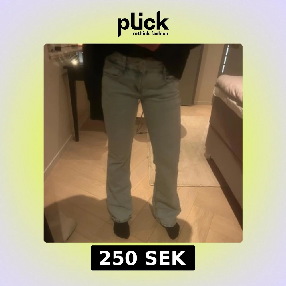 Säljer ett par ljusblå jeans med bootcut-stil. De har en klassisk design med fem fickor och knappgylf. Perfekta för en avslappnad look.