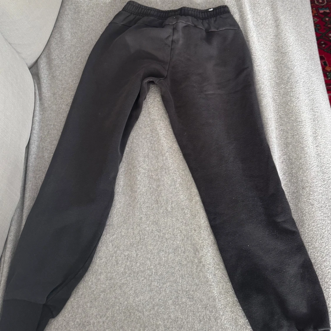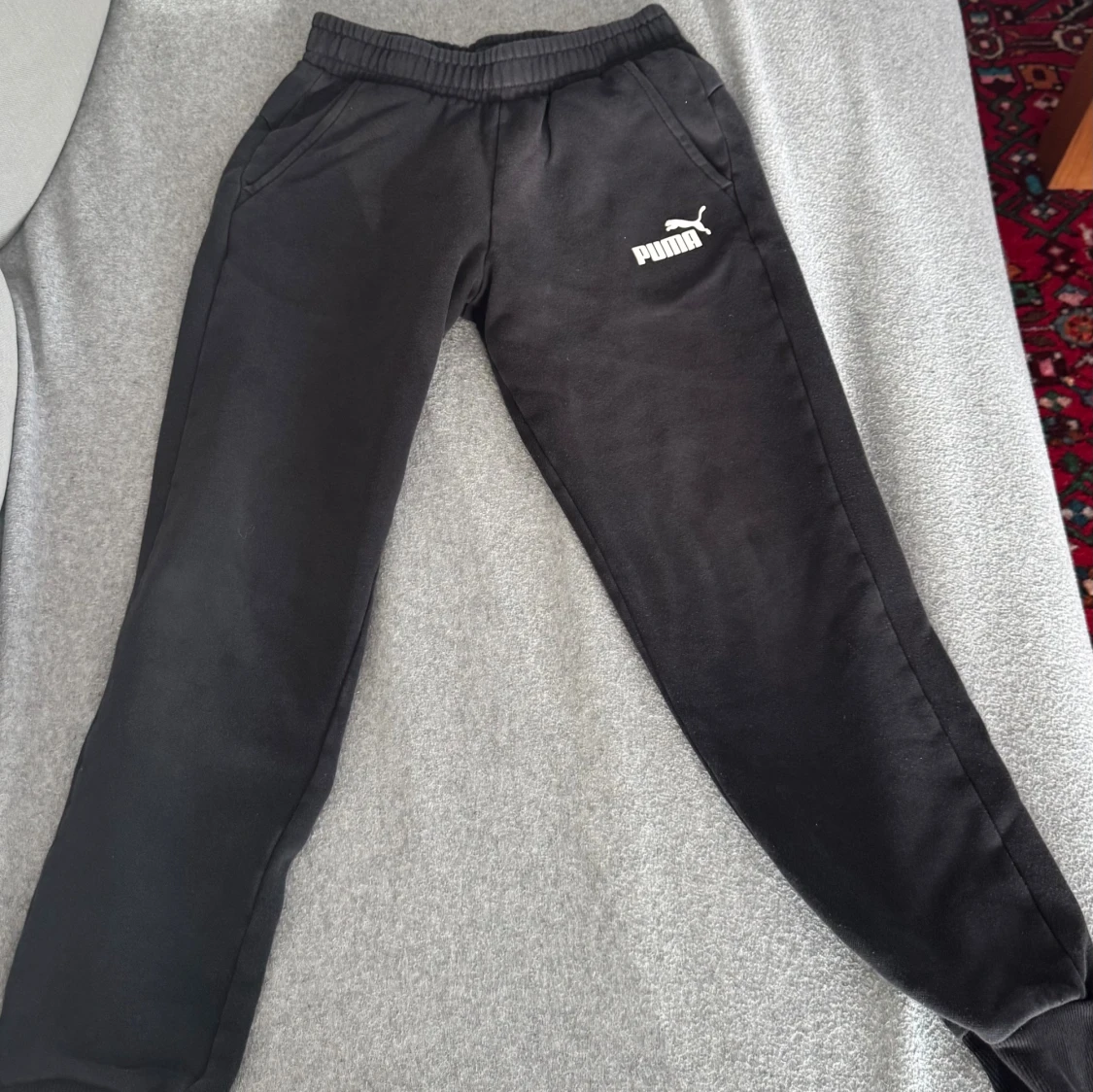 Svarta mjukisbyxor från Puma med resår i midjan och muddar vid bensluten. Byxorna har två sidofickor och en vit Puma-logga på vänster lår. Perfekta för chill eller träning, tillverkade i mjukt material för extra komfort.