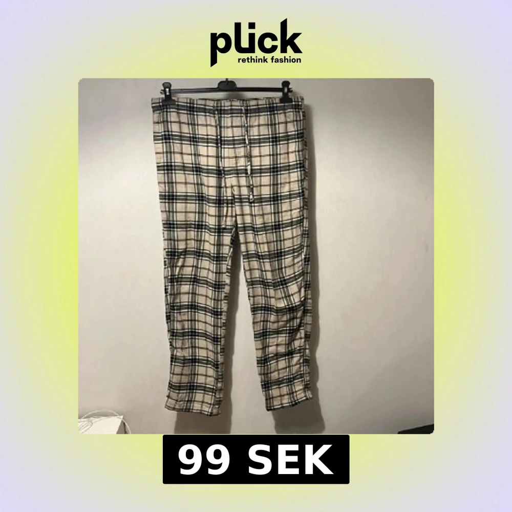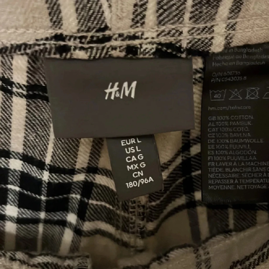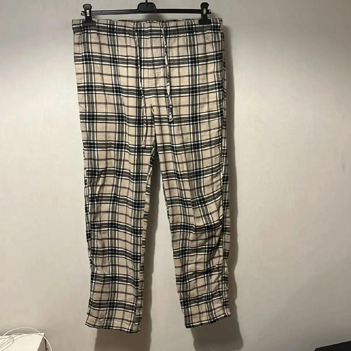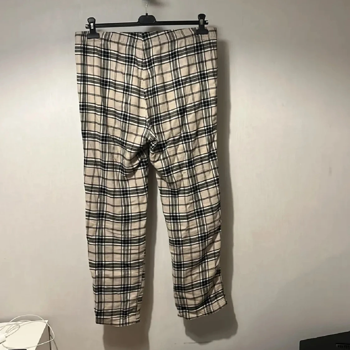 Snygga rutiga byxor från H&M i beige och svart med dragsko i midjan. Tillverkade i 100% bomull för en skön och avslappnad känsla. Perfekta för en chill och trendig look, passar till sneakers eller boots.