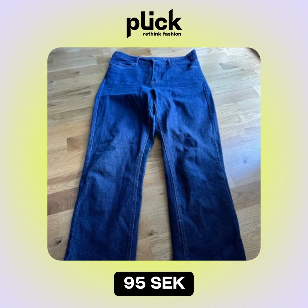 Raka jeans i mörkblå tvätt. Inte lika intensiv blå färg som på bilden. Använda ett antal gånger men fortfarande i mycket fint skick. Bra längd på mig som är 165 cm. Passar storlek M-L.